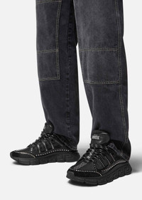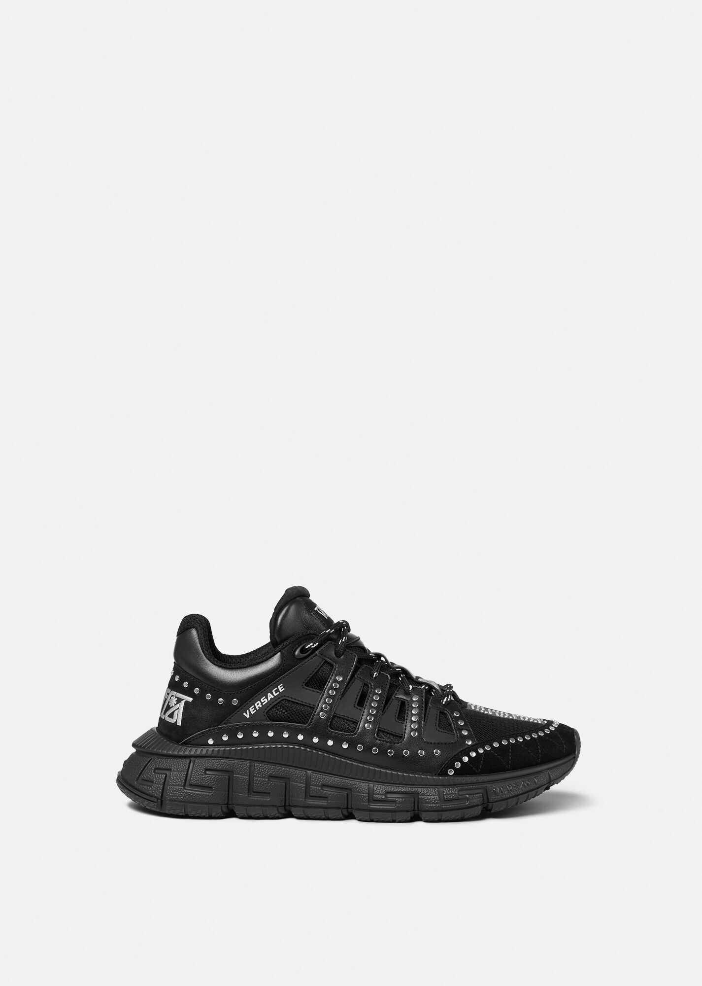 The Trigreca sneakers bring innovation to the brand's ever-evolving aesthetic. Featuring a tonal design with studded accents, three-dimensional Greca executions on the soles offer an impactful landing with the "Greca Cushioning System." In a subtle nod to Versace's home city, the uppers have a discrete print of Milan's coordinates. DETAILS & CARE - Stud detailing - Low top - Lace up - Round toe - Trigreca print on tongue and heel counter - Printed coordinates of Milan - Top-stitch detailing - Rubber Greca soles - Outer composition: 100% Calf leather - Lining 1: 100% Polyester - Lining 2:100% Calf leather - Trim 1: 100% Nylon - Trim 2:100% Calf leather - Trim 3: 90% Polyester, 10% Elastane - Sole: 100% Rubber SIZE & FIT - All sizes fit Italian standards - Fits true to size, take your normal size