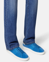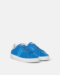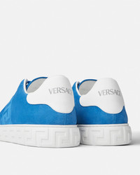 The low-top silhouette is characterized by an engraved Greca pattern on the soles and features suede uppers with a tonal thread-embroidered Greca motif on the sides. A Versace Logo stamp on the back accents the style. Greca sneakers are made using responsible materials with certified recycled content and/or are derived from renewable origin. - Greca embroidery - Versace Logo patch at the tongue - Versace Logo at the heel counter - Low top - Lace up - Outer composition: 100% Calf leather - Lining: 100% Polyester - Trim: 100% Nylon - Sole: 100% Thermoplastic polyurethane Size & Fit - The shoe weighs approximately 17.7 oz / 0.5 kg for the model size 44 IT - Footbed: comfortable - Fits true to size, take your normal size Item: 1014460-1A15305_2VL90