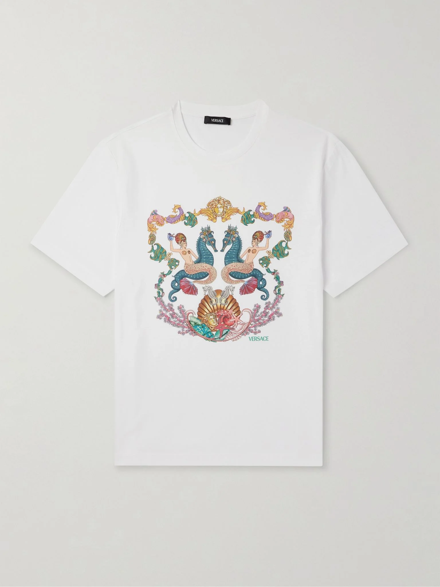The 'Coral Theatre' print adorning Versace's T-shirt is a nautical take on its signature mythological references - two sirens and, of course, the house's unmistakable 'Medusa' are among shells, coral and sea creatures. It's been made in Italy from soft cotton-jersey and cut for a relaxed fit. Size & Fit - Fits true to size. Take your normal size - Designed for a relaxed cut - Mid-weight, slightly stretchy fabric - Model is shown wearing a M - Model measures: chest 38"/ 96cm, height 6'0"/ 183cm Details & Care - Multicoloured cotton-jersey - 100% cotton - Hand wash