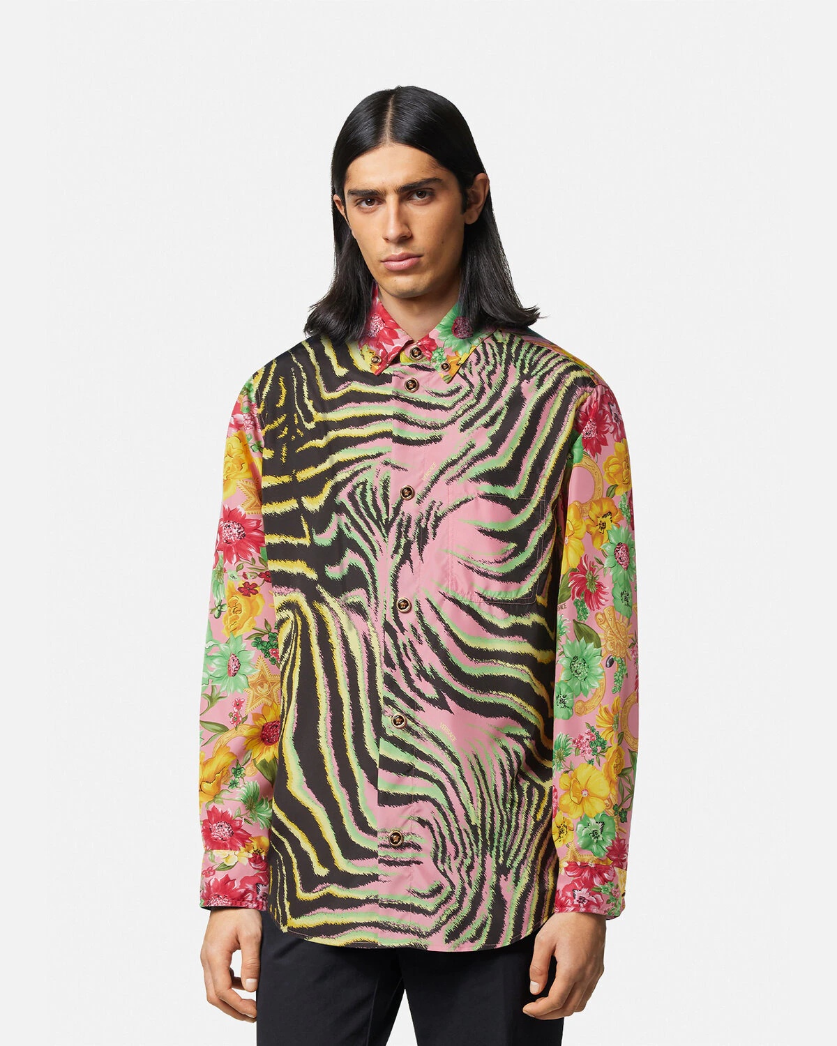 This technical long-sleeved shirt is accented by enamel Medusa hardware featuring a front Tiger printed panel and back Wildflower West print. DETAILS & CARE - Wildflower West print - Tiger print - Medusa hardware - Long sleeves - Pointed collar - Front button closure - Chest patch pocket - Buttoned cuffs - Outer composition: 100% Polyester - Machine wash cold (delicate) - Do not bleach - Do not tumble dry - Cool iron on reverse with damp cloth on top - Delicate dry clean - Wash inside out SIZE & FIT - The model is 6'1" tall and wears size 48 - All sizes fit Italian standards