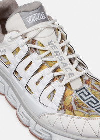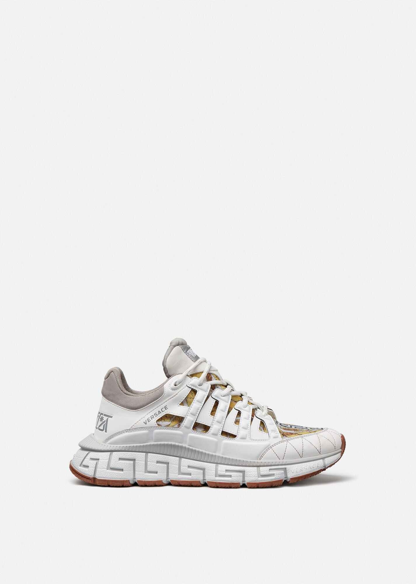 The latest addition to Versace's coveted trainer family, the Trigreca bring innovation to the brand's ever-evolving aesthetic. Referencing Versace DNA, the Trigreca feature the Barocco print and three prominent Greca executions: the midsole lateral, medial, and the bottom of the outsole. This combination creates the "Greca Cushioning System". In a subtle nod to Milan, the upper has a discrete print of the city's coordinates. DETAILS & CARE - Low top - Lace up - Barocco print - Trigreca print on the tongue and heel - Printed coordinates of Milan - Midsole lateral Greca - Midsole Medial Greca - Greca on the bottom of the TPU outsole - Top-stitching - Outer fabric: 100% Nylon - Insole: 100% Polyester - Sole: 100% Rubber - Trim: 100% Leather - Made in Italy SIZE & FIT - All sizes fit Italian standards - Fits true to size, take your normal size