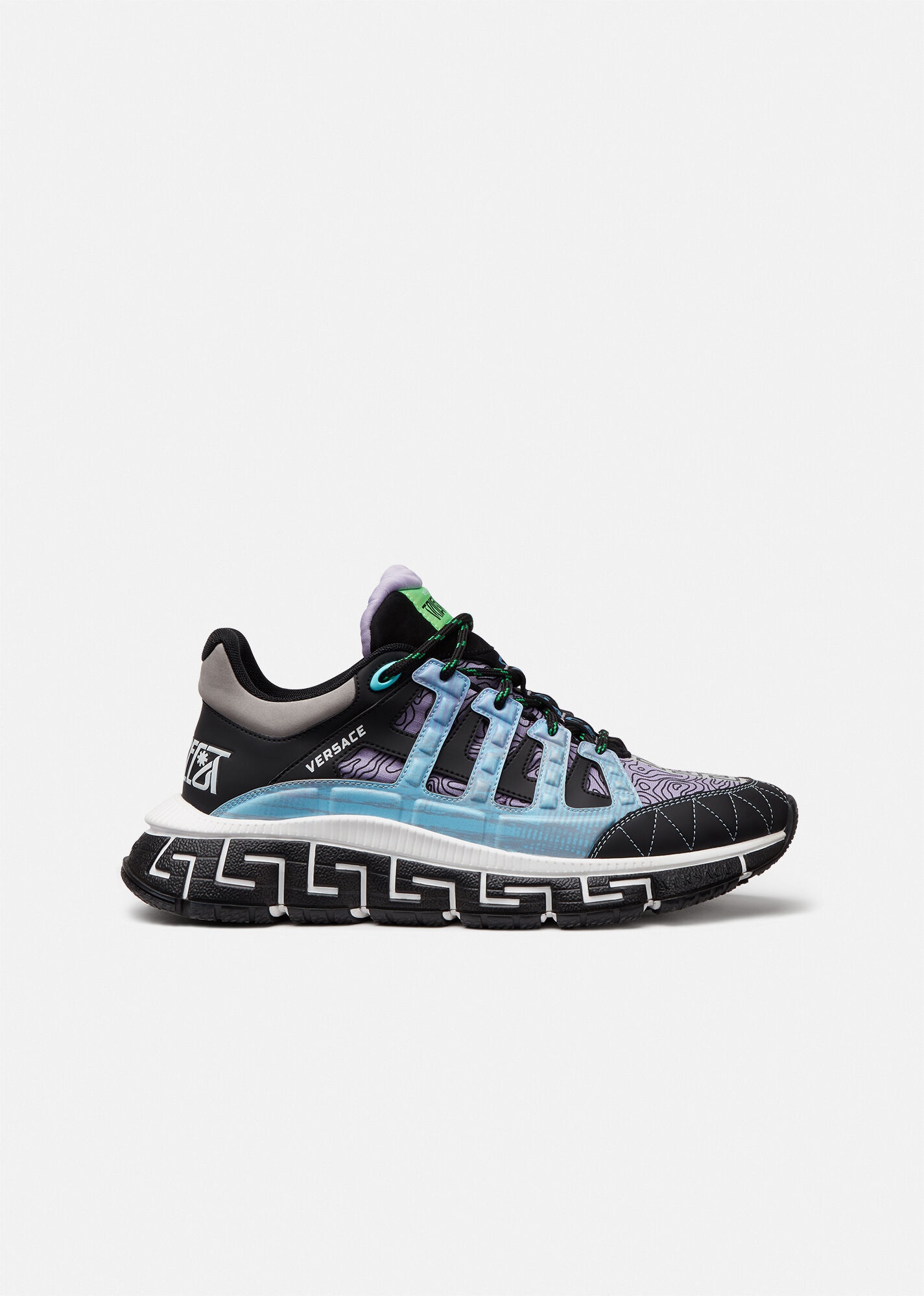 The latest addition to Versace's coveted sneaker family, the Trigreca bring innovation to the brand's ever-evolving aesthetic. Referencing Versace DNA, the Trigreca feature three prominent Greca executions: the midsole lateral, medial, and the bottom of the outsole. This combination creates the "Greca Cushioning System". In a subtle nod to Milan, the upper has a discrete print of the city's coordinates. DETAILS & CARE - Low top - Lace up - Trigreca print on the tongue and heel - Printed coordinates of Milan - Midsole lateral Greca - Midsole Medial Greca - Greca on the bottom of the TPU outsole - Top-stitching - Outer fabric: 100% Polyester - Insole: 100% Polyester - Sole: 100% Rubber - Trim: 100% Leather - Made in Italy SIZE & FIT - All sizes fit Italian standards - Fits true to size, take your normal size