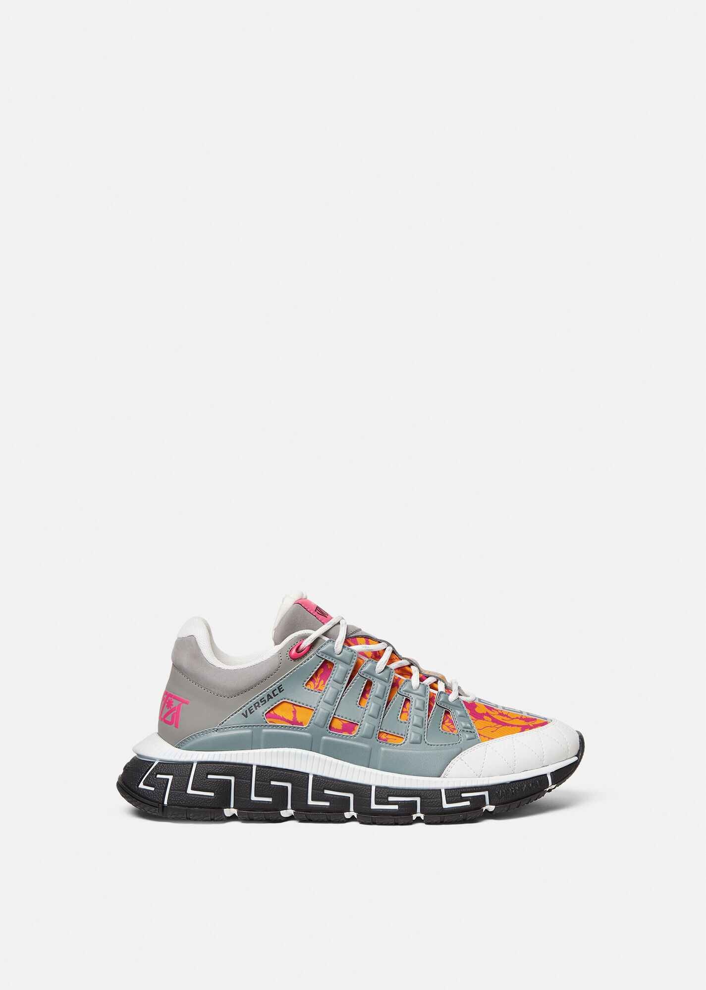 The Trigreca sneakers bring innovation to the brand's ever-evolving aesthetic. Featuring the Barocco Silhouette print on the uppers, three-dimensional Greca executions on the soles offer an impactful landing with the "Greca Cushioning System." In subtle nod to Versace's home city, the uppers have a discrete print of Milan's coordinates. DETAILS & CARE - Barocco Silhouette print - Low top - Lace up - Round toe - Trigreca print on tongue and heel counter - Printed coordinates of Milan - Top-stitch detailing - Rubber Greca soles - Outside: 65% Polyurethane, 21% Special Polyester Fibres, 14% Cotton - Lining 1: 100% Polyester - Lining 2: 100% Calf leather - Sole: 100% Rubber - Trim: 100% Polyester SIZE & FIT - Fits true to size, take your normal size - All sizes fit Italian standards
