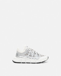 DETAILS The Trigreca sneakers bring innovation to the brand's ever-evolving esthetic. Three-dimensional Greca executions on the soles offer an impactful landing with the "Greca Cushioning System." The uppers feature a dalmatian print and are detailed with a discrete print of Milan's coordinates in a subtle nod to Versace's home city. - Trigreca print on tongue and heel counter - Printed coordinates of Milan - Round toe - Low top - Lace up - Top-stitch detailing - Rubber Greca soles - Outer composition: 100% Calf leather - Lining 1: 100% Polyester - Lining 2: 100% Calf leather - Trim 1: 100% Polyester - Trim 2: 100% Nylon - Sole: 100% Rubber Item: DSU8094-1A11552_2W270 SIZE & FIT - The shoe weighs approximately 24.7 oz / 0.7 kg for the model size 44 IT - Footbed: regular - Fits true to size, take your normal size