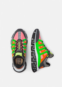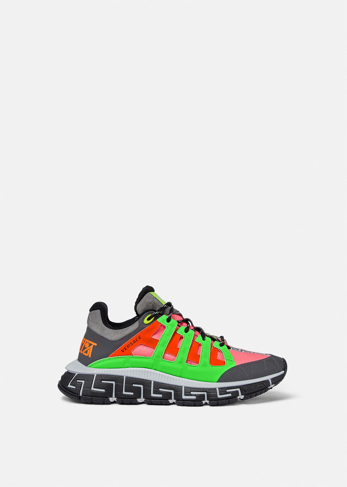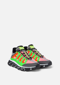 The Trigreca sneakers bring innovation to the brand's ever-evolving aesthetic. Featuring a neon design, three-dimensional Greca executions on the soles offer an impactful landing with the "Greca Cushioning System." In a subtle nod to Versace's home city, the uppers have a discrete print of Milan's coordinates. DETAILS & CARE - Low top - Lace up - Round toe - Trigreca print on tongue and heel counter - Printed coordinates of Milan - Top-stitch detailing - Rubber Greca soles - Outer composition: 100% Calf leather - Lining 1: 100% Polyester - Lining 2: 100% Calf leather - Trim 1: 100% Polyester - Trim 2: 100% Calf leather - Trim 3: 90% Polyester, 10% Elastane - Sole: 100% Rubber SIZE & FIT - All sizes fit Italian standards - Fits true to size, take your normal size