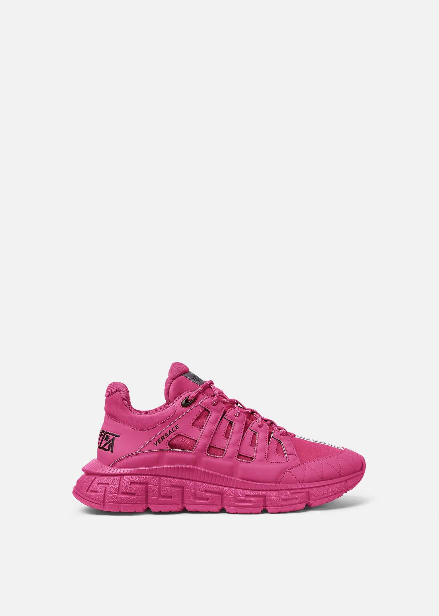 A coveted addition to Versace's sneaker family, the Trigreca bring innovation to the brand's ever-evolving aesthetic. The tonal design features three prominent Greca executions on the midsole, medial and outsole - creating the "Greca Cushioning System." In a subtle nod to Milan, the upper has a discrete print of the city's coordinates. DETAILS & CARE - Low top - Lace up - Trigreca print on the tongue and heel - Printed coordinates of Milan - Midsole lateral Greca - Midsole Medial Greca - Greca on the bottom of the TPU outsole - Top-stitching - Outer fabric: 89% Polyester 11% Cotton - Lining: 100% Calf Leather - Trim: 100% Calf Leather - Sole: 100% Rubber SIZE & FIT - Fits true to size, take your normal size - All sizes fit Italian standards