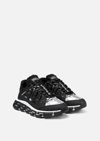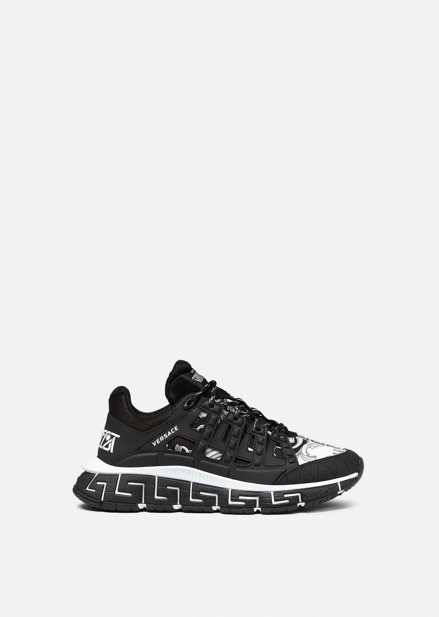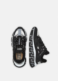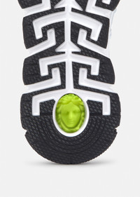 A coveted addition to Versace's sneaker family, the Trigreca bring innovation to the brand's ever-evolving aesthetic. Three-dimensional Greca executions on the soles offer an impactful landing with the "Greca Cushioning System." A subtle nod to Milan, the uppers have a discrete print of the city's coordinates. DETAILS & CARE - Low top - Lace up - Round toe - Trigreca print on tongue and heel counter - Printed coordinates of Milan - Top-stitch detailing - Rubber Greca soles - Outer fabric: 100% Polyester - Lining: 100% Calf Leather - Trim: 90% Polyester 10% Elastane - Sole: 100% Rubber SIZE & FIT - Fits true to size, take your normal size - All sizes fit Itlian standards