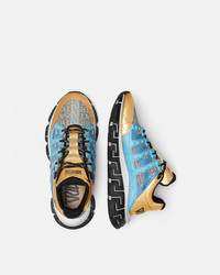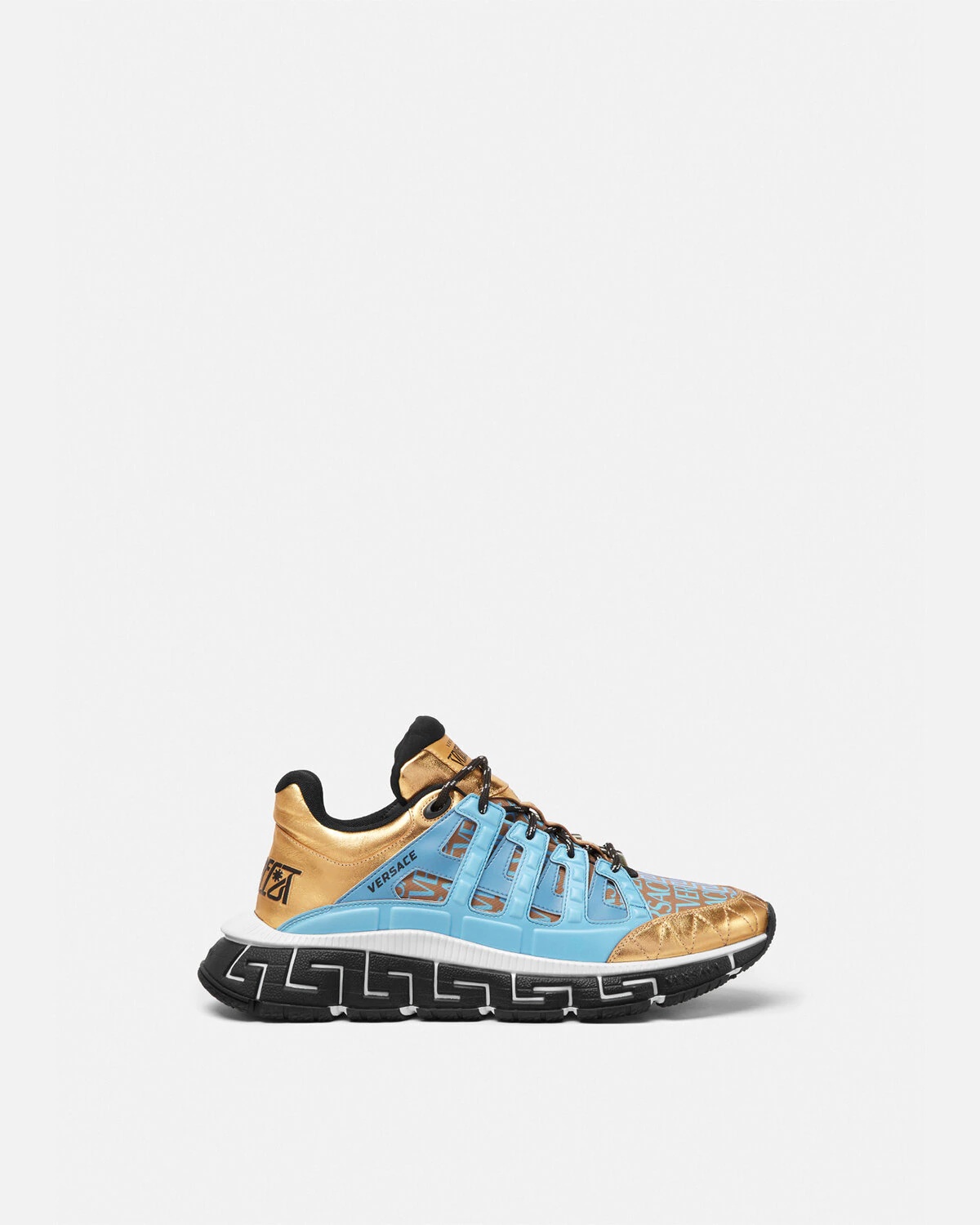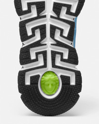 The Trigreca sneakers bring innovation to the House's ever-evolving aesthetic. Featuring the Versace Allover pattern, three-dimensional Greca executions on the soles offer an impactful landing with the "Greca Cushioning System." In a subtle nod to Versace's home city, the uppers have a discrete print of Milan's coordinates. DETAILS & CARE - Versace Allover pattern - Low top - Lace up - Round toe - Trigreca print on tongue and heel counter - Printed coordinates of Milan - Top-stitch detailing - Rubber Greca soles - Outer composition: 100% Calf leather - Lining 1: 100% Polyester - Lining 2: 100% Calf leather - Trim 1: 100% Polyester - Trim 2: 90% Polyester, 10% Elastane - Sole: 100% Rubber SIZE & FIT - The model wears size 44 - All sizes fit Italian standards - Fits true to size, take your normal size