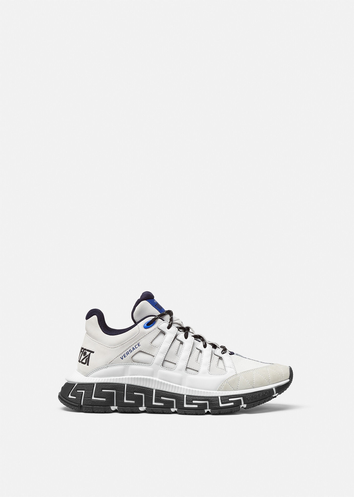 The Trigreca trainers bring innovation to the brand's ever-evolving aesthetic. Three-dimensional Greca executions on the soles offer an impactful landing with the "Greca Cushioning System." In a subtle nod to Versace's home city, the uppers have a discrete print of Milan's coordinates. DETAILS & CARE - Low top - Lace up - Round toe - Trigreca print on tongue and heel counter - Printed coordinates of Milan - Top-stitch detailing - Rubber Greca soles - Lining 1: 100% Calf leather - Lining 2: 100% Calf leather - Trim 1: 100% Nylon - Trim 2: 100% Calf leather - Trim 3: 90% Polyester, 10% Elastane - Sole: 100% Rubber SIZE & FIT - Fits true to size, take your normal size - All sizes fit Italian standards