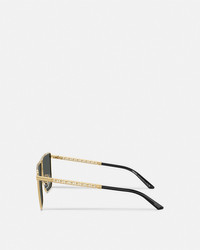 DETAILS These sleek rectangular sunglasses are characterised by a double nose bridge and a tubular Greca motif at the temples. - Greca motif - Frame color: Gold - Temple color: Gold - Lens color: Dark gray - Frame: Metal - Temple: Metal Item: O2266-O10028764_RTU_TU_ONUL__ SIZE & FIT - Eye size: 2.5" - Bridge: 0.4" - Temple: 5.7"