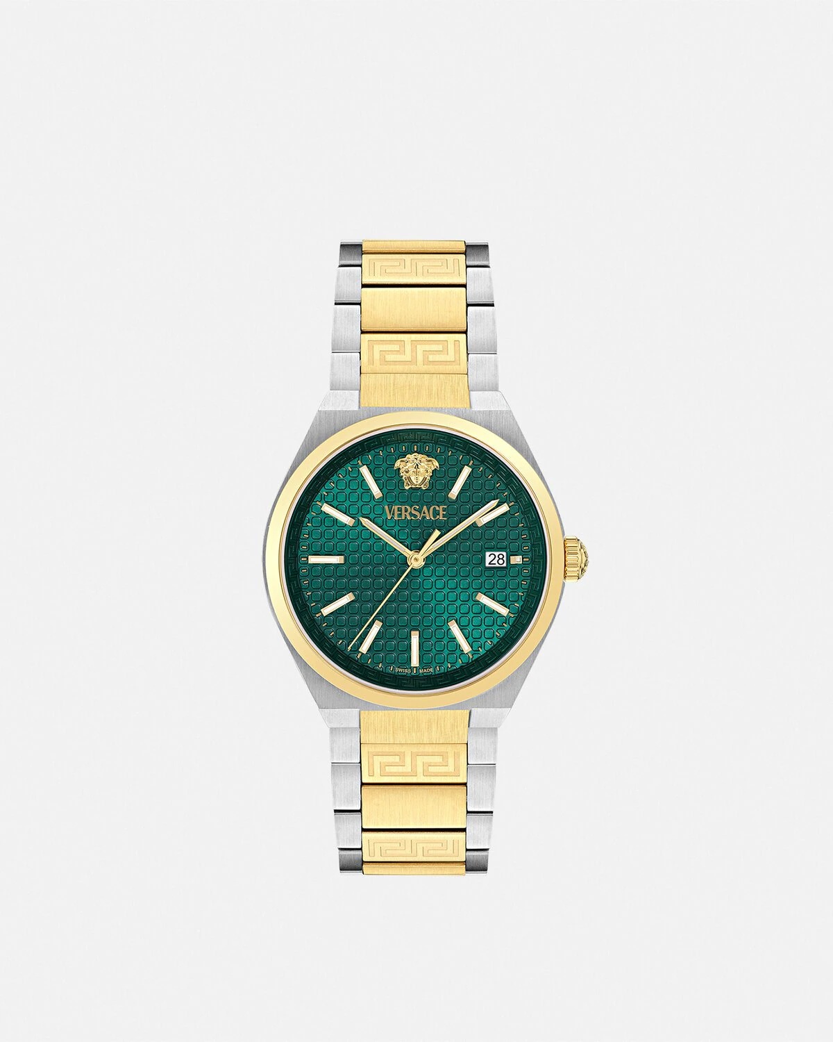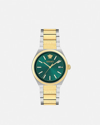 DETAILS Timeless elegant and iconic the VAuria watch features a guilloch dial with the Houses Medusa and Versace Logo at 12 oclock An engraved Greca motif on the bracelet completes the unique design All Versace watches are guaranteed by the Swiss Made marking All stainless steel is recycled - Case: IP2N case - Dial: Green guilloche dial with Versace Logo and Medusa at 12h - Bracelet: Bicolor (SS&IP2N) bracelet with butterfly buckle and Greca details - Movement: RONDA 515.2 Swiss Quartz 3 hands movement - Water Resistant: 5 ATM Item: PVE0F004-P0025_PNUL SIZE & FIT - Case: 1.5" / 39 mm