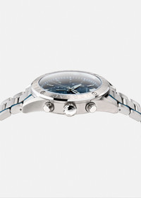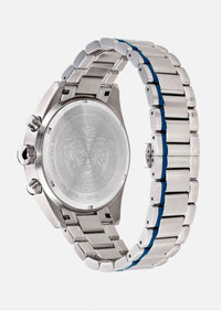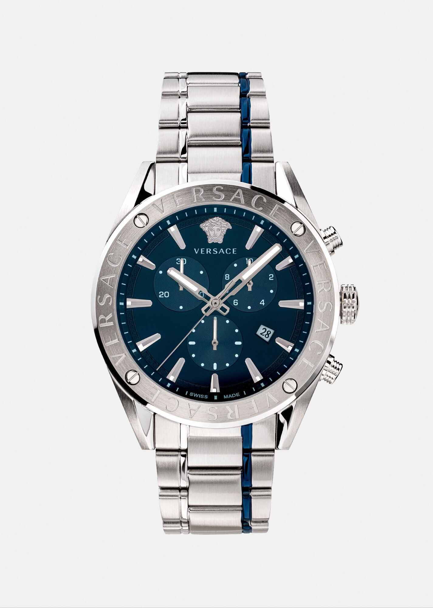 A timeless watch with a modern feel - the V-Chrono boasts a blue dial enriched by the Medusa and three counters. The silver top ring is enriched with the Versace logo. The timepiece features a sleek, silver metal band. DETAILS & CARE - Case: Round, silver tone - Dial: Blue with 3 counters, Versace on the top ring - Bracelet: Silver metal band SIZE & FIT - Case: 44 mm