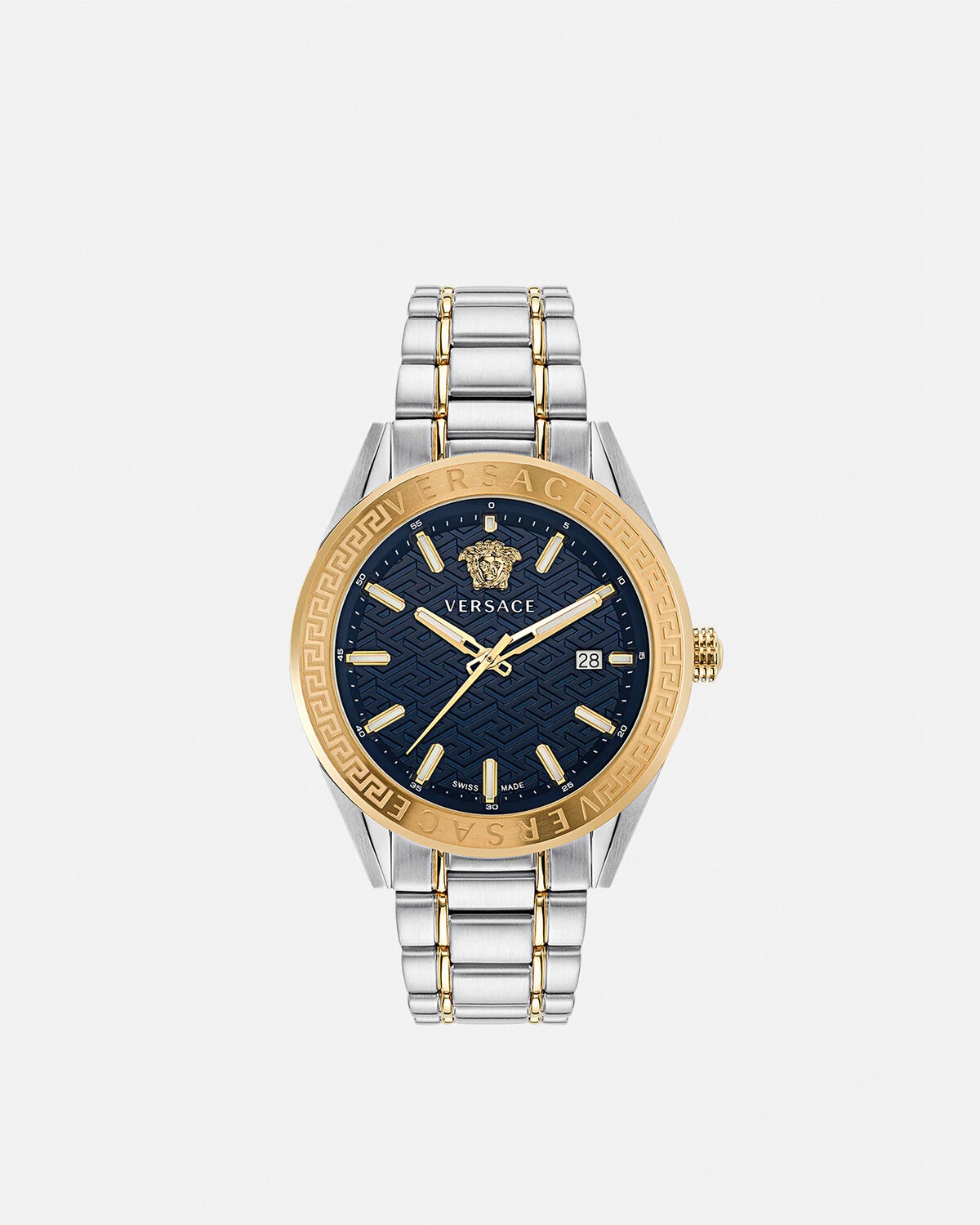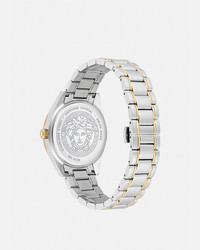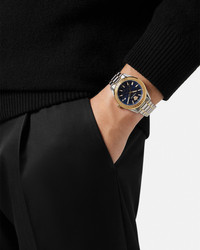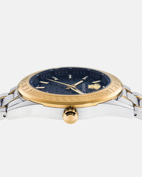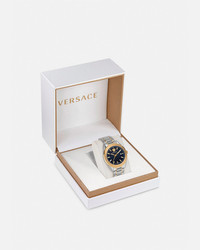 A timeless timepiece featuring the Greca motif and Versace lettering on the top ring. The La Greca pattern details the dial with the Medusa at 12 o'clock. The accessory is complete with metal band. All Versace watches are guaranteed by the 'Swiss Made' marking. DETAILS & CARE - Case: Stainless Steel and IP Champagne case with Versace logo on the top ring - Dial: Blue dial with Greca pattern; Versace logo and Medusa at 12h - Bracelet: Stainless Steel and IP Champagne band with butterfly buckle - Movement: RONDA 515.1 Swiss quartz 3-hands movement; Date at 3h - Water Resistant: 5 ATM SIZE & FIT - Case size: 1'7" in