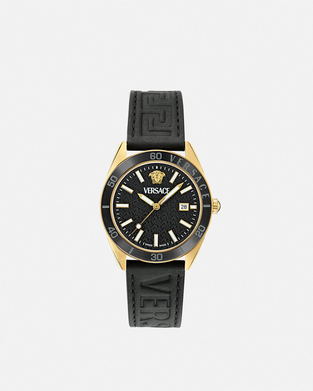 DETAILS An iconic timepiece featuring an innovative design characterised by a dome-shaped glass and a bold top ring with Versace lettering. The dial has an all-over logo pattern and a three-dimensional Medusa accent at 12 o'clock. The case is enriched with 3-hands movement, a date window at 3 o'clock and the tachymeter on the top ring. All Versace watches are guaranteed by the 'Swiss Made' marking. - Case: Stainless Steel case with tachymeter and Versace logo on top ring - Dial: Black dial with Versace Allover / Versace logo and Medusa at 12h - Bracelet: Black calf leather strap with Versace and Greca motif and sporty tongue buckle - Movement: RONDA 715 Swiss Quartz 3-hands movement / Date at 3h - Water Resistant: 5 ATM Item: PVE8E002-P0024_RTU_TU_PNUL__ SIZE & FIT - Case: 1.7"