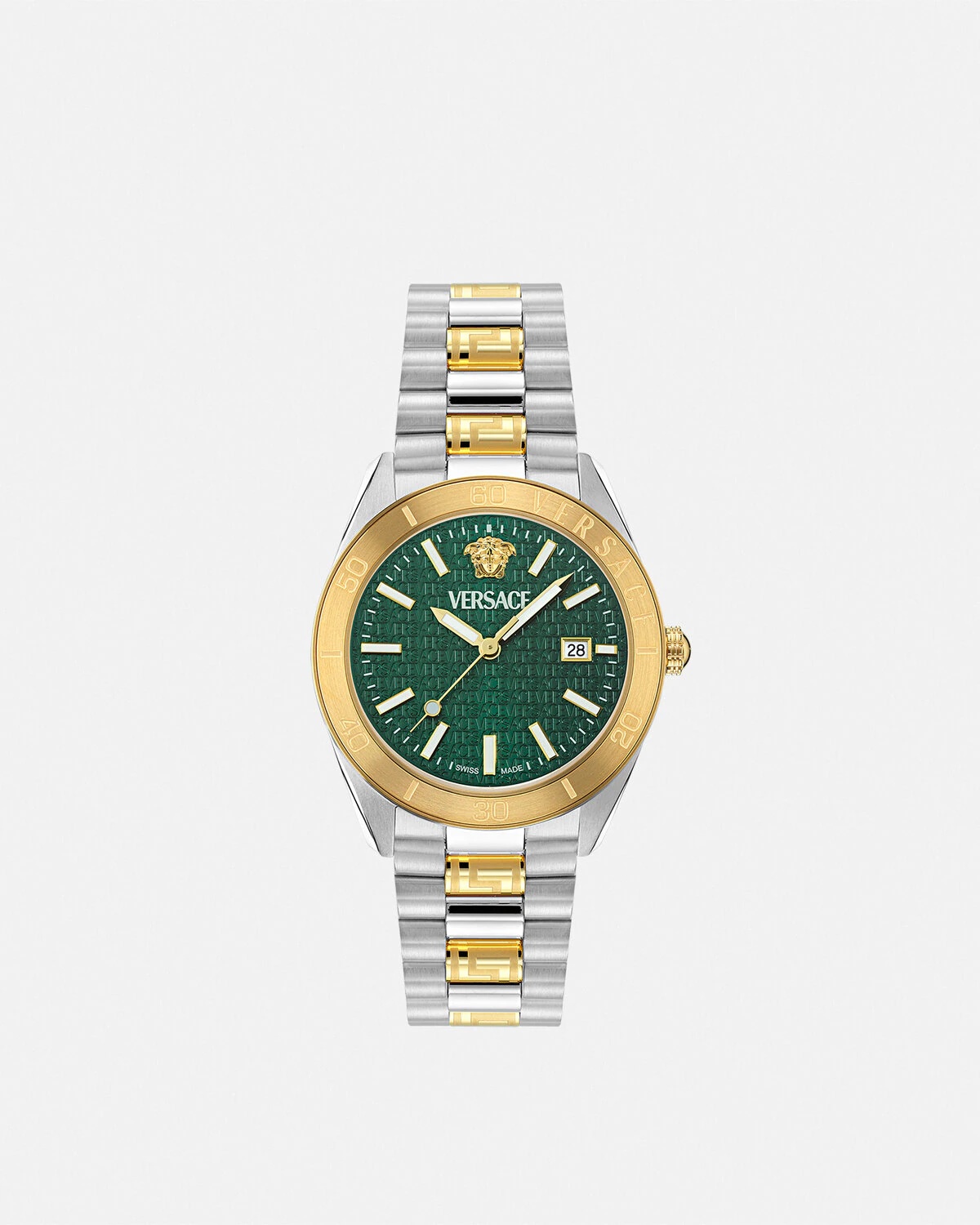 DETAILS An iconic timepiece featuring an innovative design characterised by a dome-shaped glass and a bold top ring with Versace lettering. The dial has an all-over logo pattern and a three-dimensional Medusa accent at 12 o'clock. The case is enriched with 3-hands movement, a date window at 3 o'clock and the tachymeter on the top ring. All Versace watches are guaranteed by the 'Swiss Made' marking. - Case: Bicolor (SS&IP2N) case with tachymeter and Versace logo on top ring - Dial: Green dial with Versace Allover / Versace logo and Medusa at 12h - Bracelet: Bicolor (SS&IP2N) bracelet with Greca motif and butterfly buckle - Movement: RONDA 715 Swiss Quartz 3-hands movement / Date at 3h - Water Resistant: 5 ATM Item: PVE8E005-P0024_RTU_TU_PNUL__ SIZE & FIT - Case: 1.7"