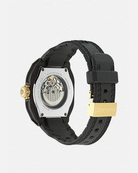 DETAILS A futuristic timepiece with a stand-out automatic skeleton movement visible through the dial and see-through case back. The dial has the Versace logo and Greca, the strap features the 3D logo at 12h and the 3D Medusa at 6h, while the extra-large crown features an embossed Medusa and Greca motif. All Versace watches are guaranteed by the 'Swiss Made' marking. - Case: Black Eco Ceramic case / XL crown with Greca and Medusa motif - Dial: IP2N skeleton dial with Versace logo and Medusa at 12h - Bracelet: Black recycled PU strap with Versace logo at 12 / Medusa at 6h, and Greca on borders / butterfly buckle - Movement: DP 24 Swiss Automatic Skeleton movement - Water Resistant: 3 ATM Item: PVE7L001-P0023_RTU_TU_PNUL__ SIZE & FIT - Case: 1.7"