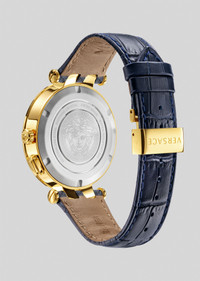 Elegant and timeless, the V-Race watch is distinguished by a lustrous golden top ring enriched with an engraved logo pattern. The multifunction blue dial boasts subtle Medusa and Greca accents, while the supple leather bracelet features a mock-alligator texture. DETAILS & CARE - Case: Gold-tone with engraved logos on the top ring - Dial: Blue, multifunction dual time, date at 6 o'clock, Medusa at 12 o'clock - Bracelet: Blue leather with a mock-alligator pattern, butterfly buckle