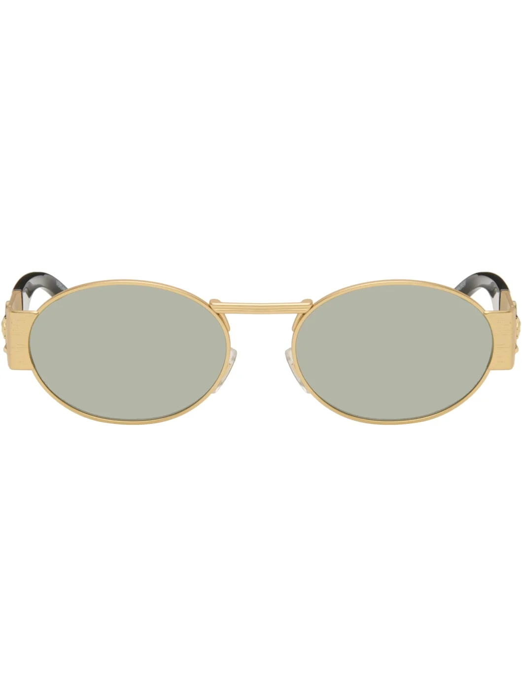 Oval brushed metal-frame sunglasses. · Gray lenses · 100% UVA/UVB protection, category 3 · Adjustable rubber nose pads · Logo hardware and cutout at temples · Black acetate trim at temple tips · Includes case · Size: 56.18 140 Supplier color: Gold Metal, acetate. Made in Italy 252404M134014