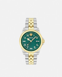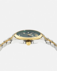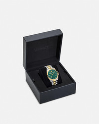 DETAILS The Versace Anteo watch is characterized by a monochromatic Versace Allover pattern on the dial. The design has a 3 hands movement and is enriched by the Medusa at 12 o'clock and an engraved Versace logo on the case. All Versace watches are guaranteed by the 'Swiss Made' marking. All stainless steel is recycled. - Case: Stainless Steel case - Dial: Green patterned dial with Medusa and Versace logo at 12h - Bracelet: Bicolor (Stainless Steel & IP2N) band with butterfly buckle - Movement: RONDA 512.2 Swiss Quartz 3-hands movement - Water Resistant: 5 ATM Item: PVE9H005-P0024_RTU_TU_PNUL__ SIZE & FIT - Case: 1.6" / 41 mm