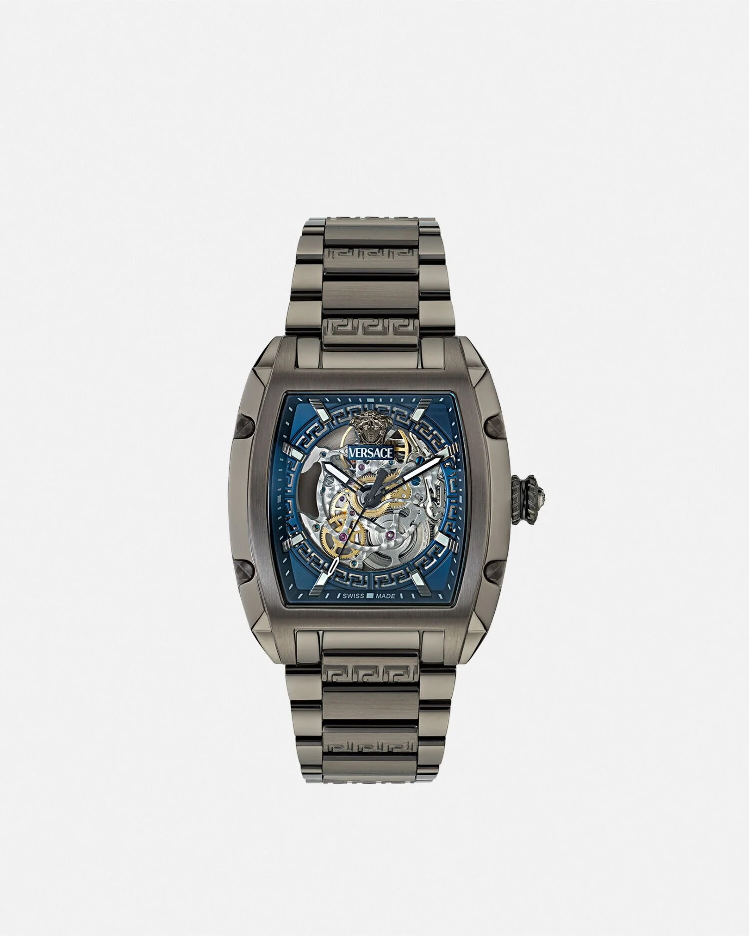 The Versace Dominus Skeleton is a sleek and sophisticated limited-edition timepiece with only 500 available worldwide. The watch combines elements from the iconic Versace Dominus and V-legend Skeleton. The design features a tonneau case and an intricate skeleton automatic movement. It is further enriched with Versace symbols, including the Medusa, signature Greca pattern, and Versace logo. All Versace watches are guaranteed by the 'Swiss Made' marking. All stainless steel is recycled. - Case: IP Gunmetal case - Dial: Blue skeleton dial with Versace logo and Medusa at 12h - Bracelet: IP Gun bracelet with butterfly buckle - Movement: DP24SKE Swiss Auto Skeleton 3-hands movement - Water Resistant: 5 ATM Size & Fit - Case: 1.9" x 1.7" / 49.5 x 42 mm Item: PVE9J002-P0024_RTU_TU_PNUL__
