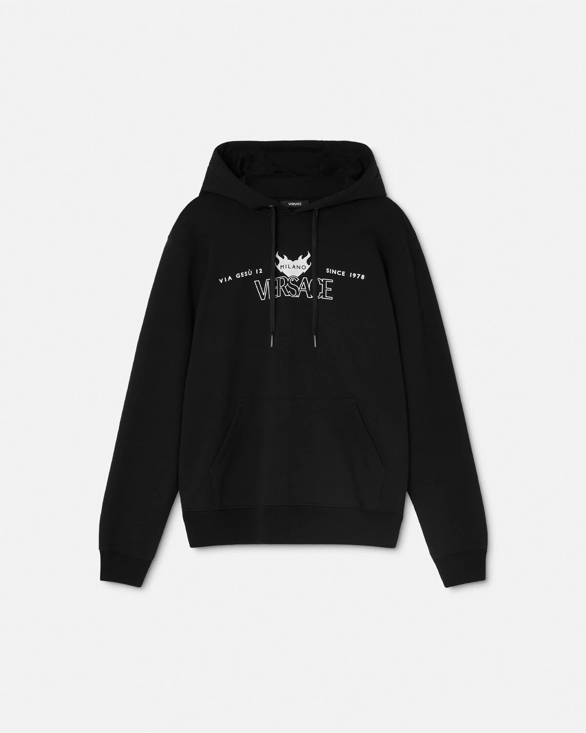 DETAILS This hooded cottonjersey sweatshirt features a Versace Logo motif at the front with the Houses founding year 1978 - Versace Logo motif - Long sleeves - Drawstring hood - Kangaroo pocket - Elastic waistband and cuffs - Outer composition: 100% Cotton - Lining: 100% Cotton - Trim: 100% Cotton Item: 1018794-1A14363_2B510 SIZE & FIT - The model is 6'2" / 1.87 m tall and wears size M