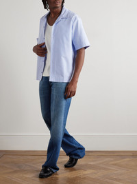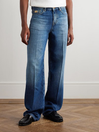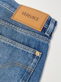 Versace's jeans are detailed with the house's 'Medusa' charm on the coin pocket. Made from Lyocell-denim, they're heavily faded through the thighs and pressed with sharp creases along the legs. Style yours with a printed shirt and loafers. Size & Fit - Fits true to size. Take your normal size - Regular-straight leg, mid-rise style - Mid-weight, non-stretchy fabric - Model is shown wearing a 32 - Model measures: waist size 32, height 6'1"/ 188cm Details & Care - Blue denim - Button and zip fastening - 100% Lyocell; trim: 100% leather (Calf) - Machine wash