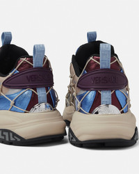 DETAILS An extension to the futuristic design of the Versace Mercury line fusing the codes of the House with intricate craftsmanship Versace Mercury MVS03 is set on lightweight shockabsorber Greca rubber and EVA soles The pair features colourblock mesh uppers with metallic inserts and a handknotted rope construction Screenprinted Mercury lettering is featured at the footbed and the Versace Logo lettering details the sides and a metallicfinished plaque at the heel counter - Versace Logo on tongue - M_VS_03 style code on heel counter - Greca pull tabs - Versace Logo engraved on back metal loop - Low top - Lace-up - Round toe - High rebound performance - Outer composition: 100% Polyester - Lining 1: 100% Nylon - Lining 2: 100% Calf leather - Lining 3: 100% Goat leather - Trim: 100% Goat leather - Sole: 100% Rubber Item: 1016307-1A12682_6K640 SIZE & FIT - The shoe weighs approximately 21.2 oz / 0.6 kg for the model size 44 IT - Footbed: comfortable - Fits true to size, take your normal size