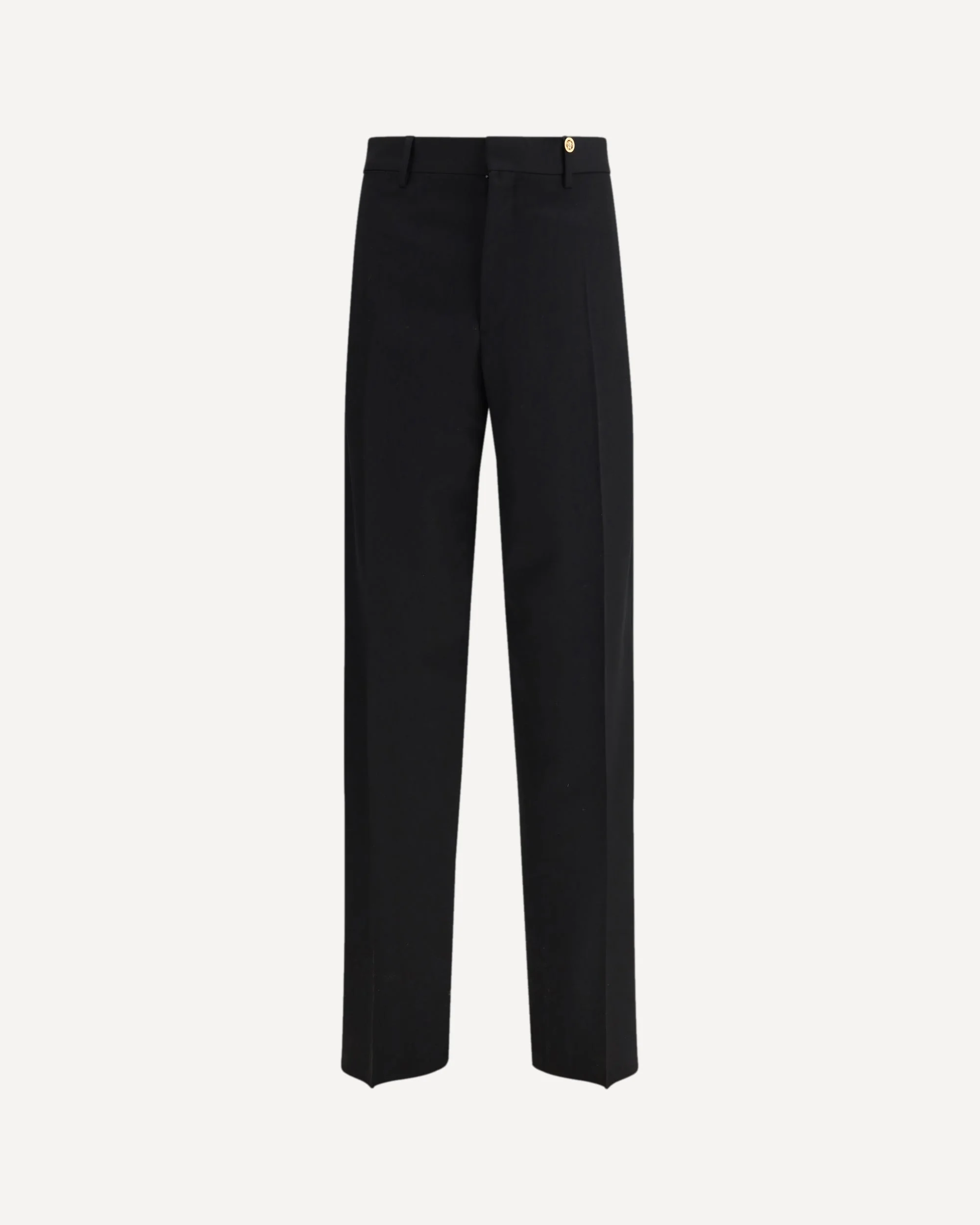 The formal wool Trousers by Versace reinterpret tailored elegance with a contemporary lightness. Crafted from fine grain de poudre wool, they follow the silhouette with a flawless slim fit. A tonal jacquard sartorial label on the back subtly but decisively signatures the design. The concealed hook-and-zip closure maintains clean, uninterrupted lines, while the side pockets and back welt pockets offer practicality infused with the refined sophistication that defines the Maison. DETAILS - Sku: 10221851A16732_1B000 - Season: SS26 - Fit: Regular - Composition: OUTER 100% Fleece Wool INNER 100% Cupro - MADE IN ITALY