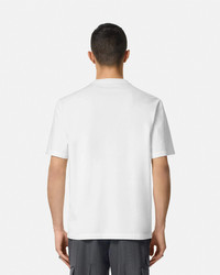 DETAILS This regularfit shortsleeved compact cotton jersey Tshirt features the Versace logo and an archival Medusa image photographed by Irving Penn - Medusa Medallion print - Short sleeves - Crewneck - Outer composition: 100% Cotton - Trim: 100% Cotton Item: 1013302-1A12439_2W580 SIZE & FIT - The model is 6'2" / 1.88 m tall and wears size M