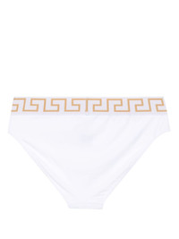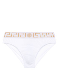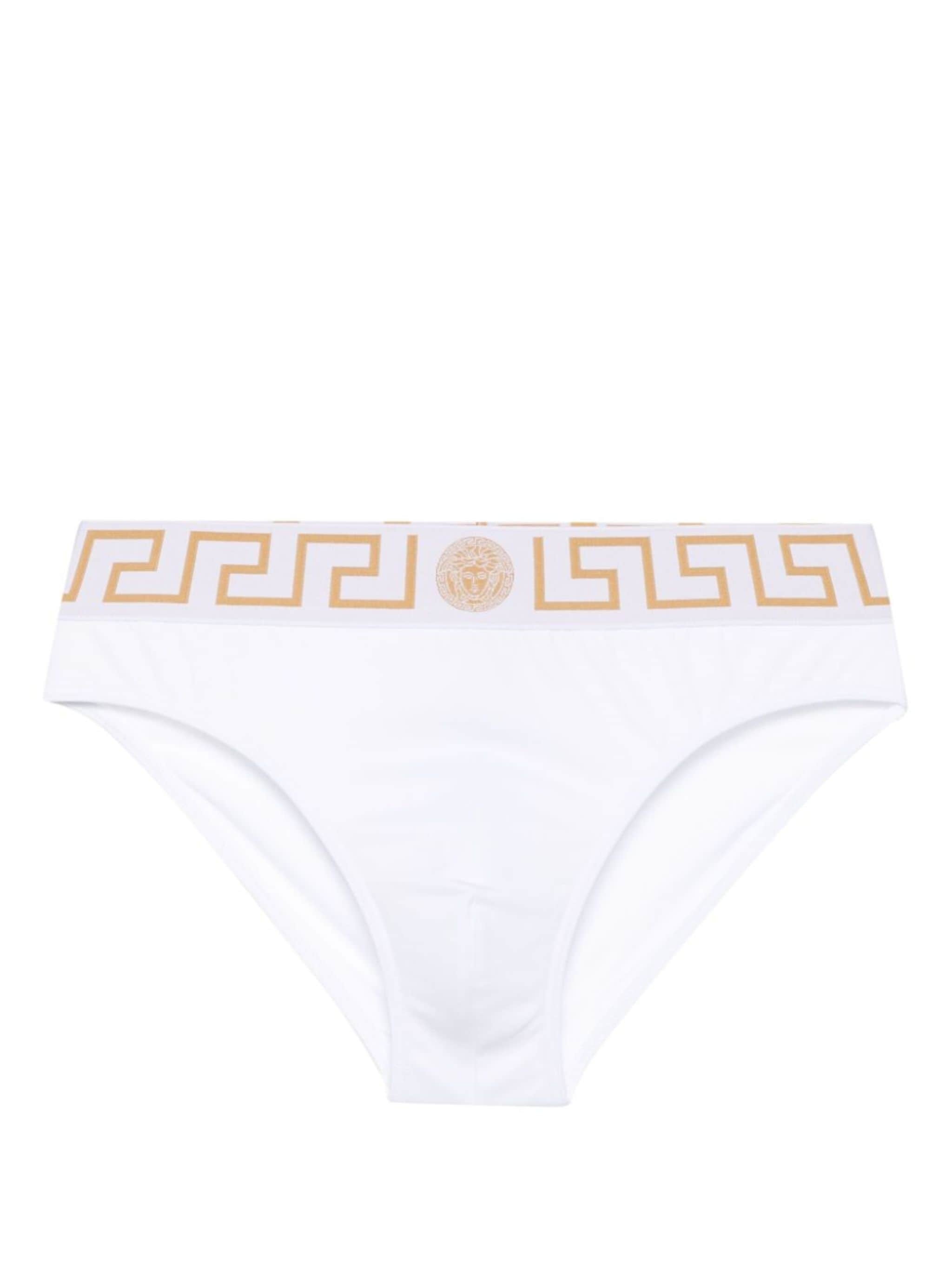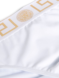 white/gold-tone lightweight elasticated logo waistband with signature Greca detailing and Medusa Head motif full lining slip-on style Be mindful to try on swimwear over your own garments. Size & Fit Model Measurements: Bust: 0cm Height: 0cm Hips: 0cm Waist: 0cm Fabric and Care Designer Style ID: ABU010251A11119 Designer Colour: 2W110 - WHITE + GOLD Composition: Outer: Elastane 22%, Polyamide 78%; Lining: Elastane 12%, Polyester 88% Washing instructions: Hand Wash Made in Italy