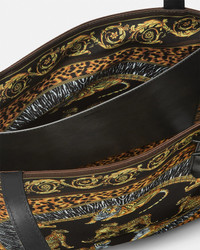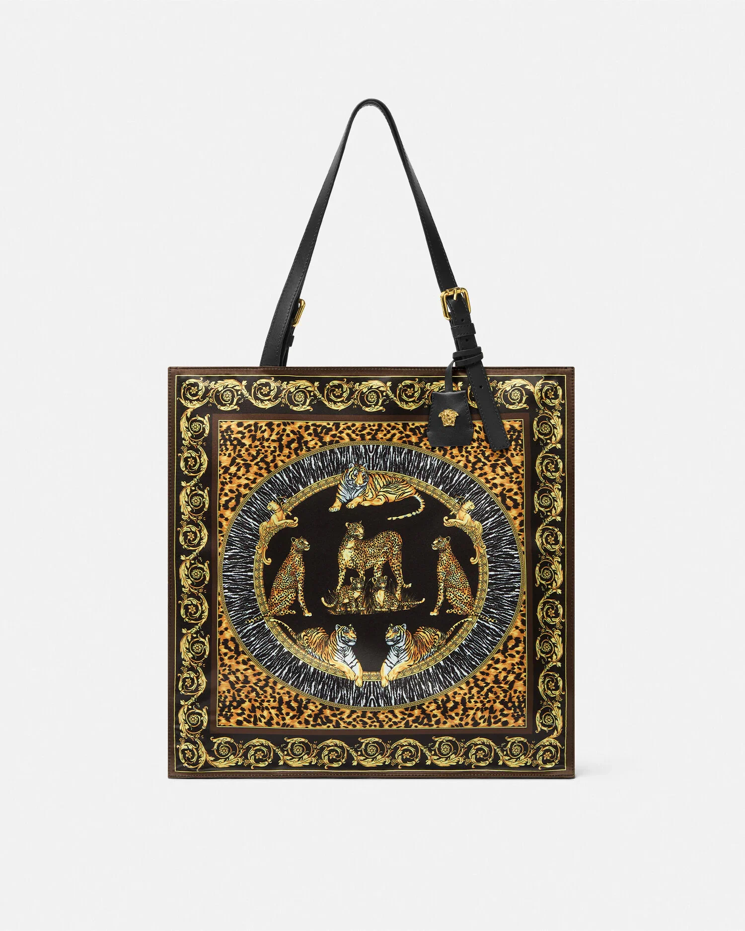 A vertical tote bag featuring a foulard Wild Cats print with a semi-shiny duchesse finish. The spacious accessory features an interior leather slip pocket, adjustable leather handles and a detachable leather keychain with Medusa hardware. - Wild Cats print - Medusa hardware - Open top - Adjustable top handles - Interior slip pocket - Outer Composition: 100% Polyester - Trim: 100% Calf Leather Size & Fit - L16.5 x W3.9 x H0.4" / L42 x W10 x H42 cm - Handle drop: 27.5-11.8-12.8" / 30-32.5 cm - Approximate weight: 3.5 oz / 0.1 kg Item: 1021240-1A15810_DTU_UNICA_5E67V__