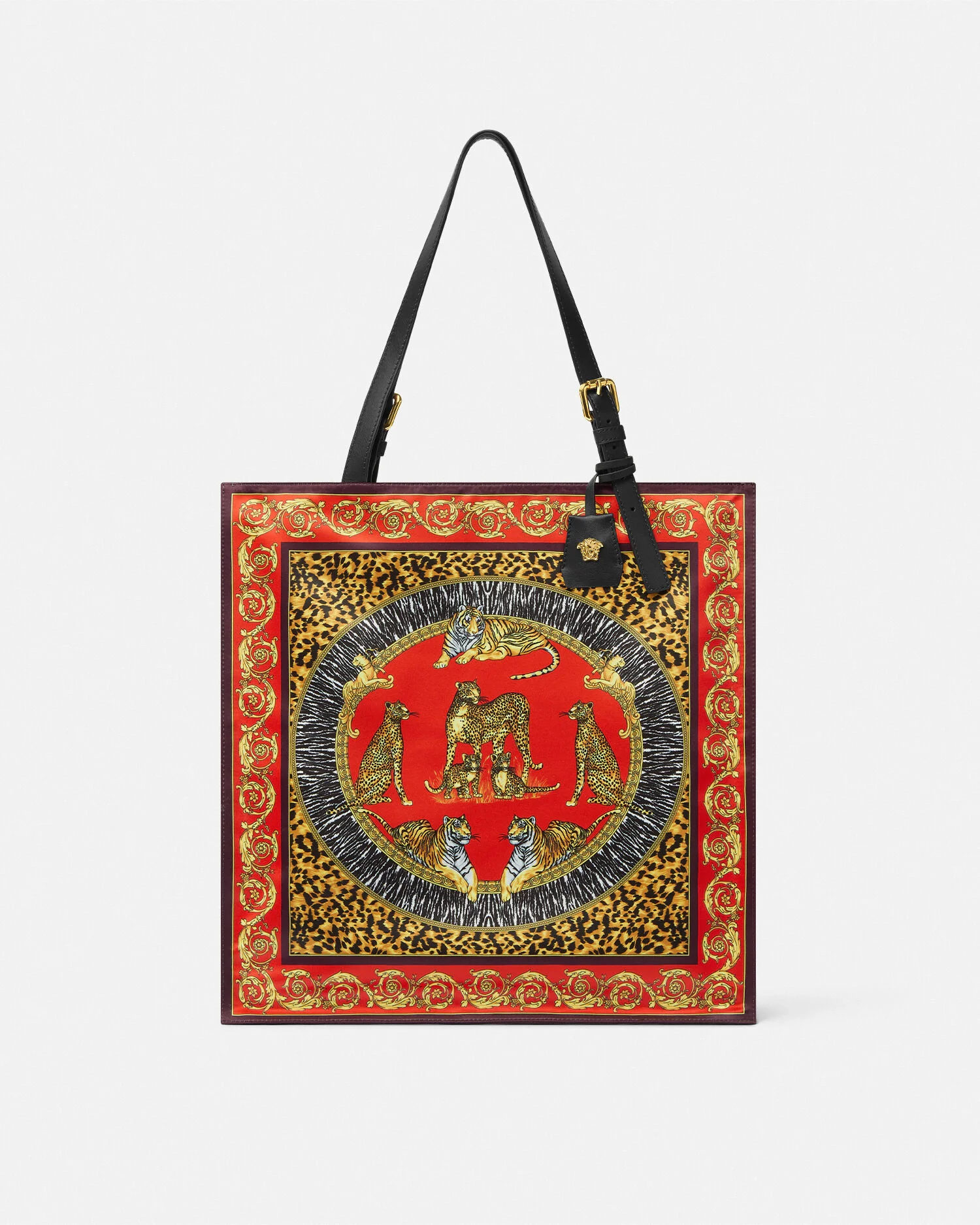 A vertical tote bag featuring a foulard Wild Cats print with a semi-shiny duchesse finish. The spacious accessory features an interior leather slip pocket, adjustable leather handles and a detachable leather keychain with Medusa hardware. - Wild Cats print - Medusa hardware - Open top - Adjustable top handles - Interior slip pocket - Outer Composition: 100% Polyester - Trim: 100% Calf Leather Size & Fit - L16.5 x W3.9 x H0.4" / L42 x W10 x H42 cm - Handle drop: 27.5-11.8-12.8" / 30-32.5 cm - Approximate weight: 3.5 oz / 0.1 kg Item: 1021240-1A15810_DTU_UNICA_5R69V__