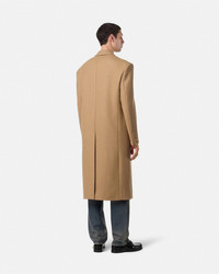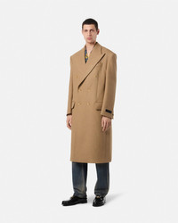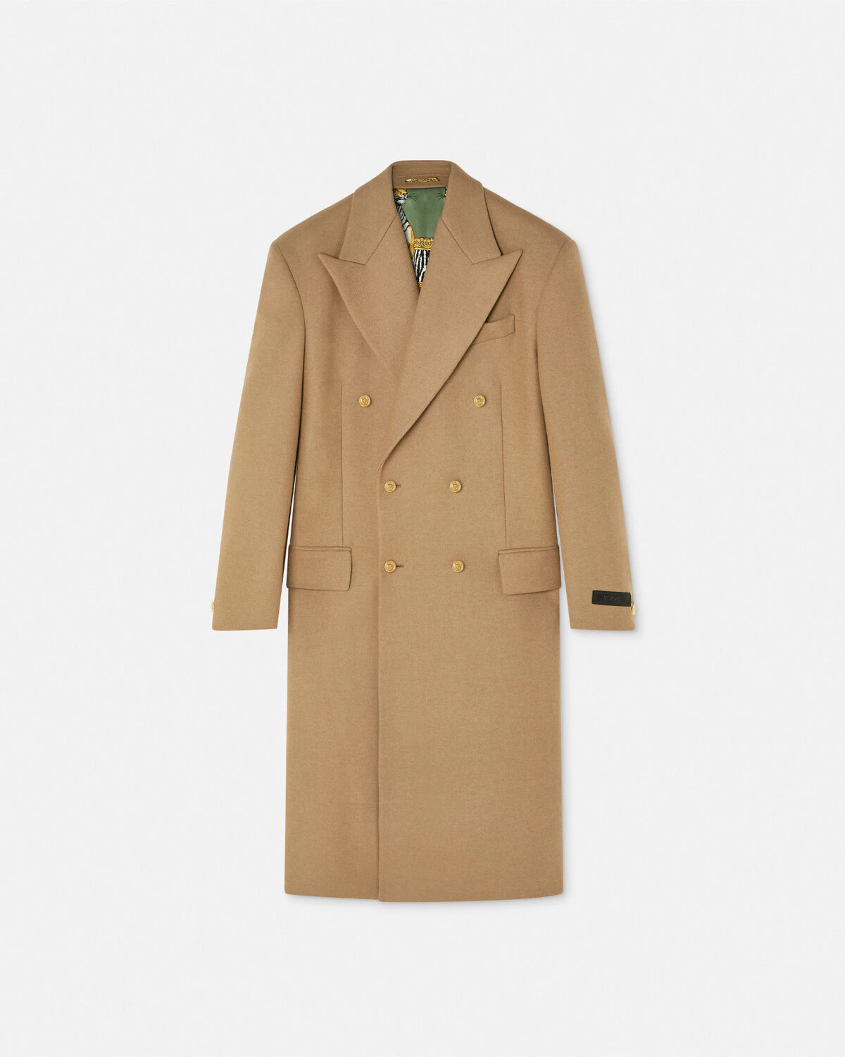 DETAILS This doublebreasted coat in a wool blend features a Wild Cats printed lining a reinterpretation of an archival print of the animal kingdom with zebra and leopard patterns The sartorial style has a peaked lapel accent Medusa buttons and a jacquard Versace tailoring label on the sleeve - Wild Cats print lining - Versace tailoring label - Long sleeves - Peaked lapel - Front flap pockets - Chest welt pocket - Interior welt pockets - Front button closure - Buttoned cuffs - Back vent - Outer Composition: 86% Wool, 14% Polyamide - Lining 1: 100% Polyester - Lining 2: 100% Cupro - Lining 3: 100% Cotton Item: 1021533-1A09780_1KD60 SIZE & FIT - The model is 6'2" / 1.87 m tall and wears size 48 IT