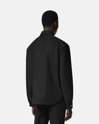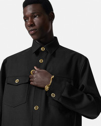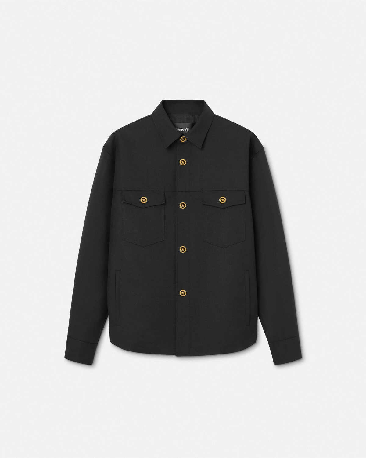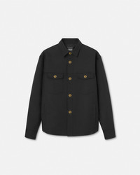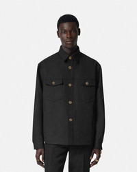 DETAILS A cavalry wool blouson overshirt with accent enamel Medusa buttons - Medusa hardware - Long sleeves - Pointed collar - Chest flap pockets - Front snap-button closure - Snap-buttoned cuffs - Outer composition: 100% Pure virgin wool - Lining 1: 100% Cupro - Lining 2: 100% Cotton Item: 1018867-1A08771_1B000 SIZE & FIT - The model is 6'1" / 1.87 m tall and wears size 48 IT