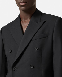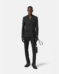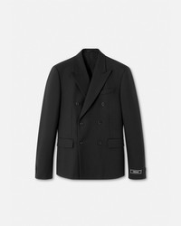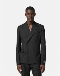 DETAILS This slim double-breasted blazer is made from wool with peaked lapels and has a tailoring label on the sleeve cuffs. The sartorial style is detailed with a tonal jacquard Barocco lining and can be paired with matching suit pants. - Tailoring label - Barocco lining - Long sleeves - Front button closure - Chest welt pocket - Front flap pockets - Buttoned cuffs - Back single vent - Fully lined - Outer composition: 100% Pure virgin wool - Lining 1: 58% Cupro, 42% Viscose - Lining 2: 100% Cupro - Lining 3: 100% Cotton Item: 1012492-1A07978_1B000 SIZE & FIT - In Versace’s Show Fit: designed for a slim silhouette - The model is 5'8" tall and wears size 38 IT