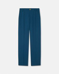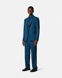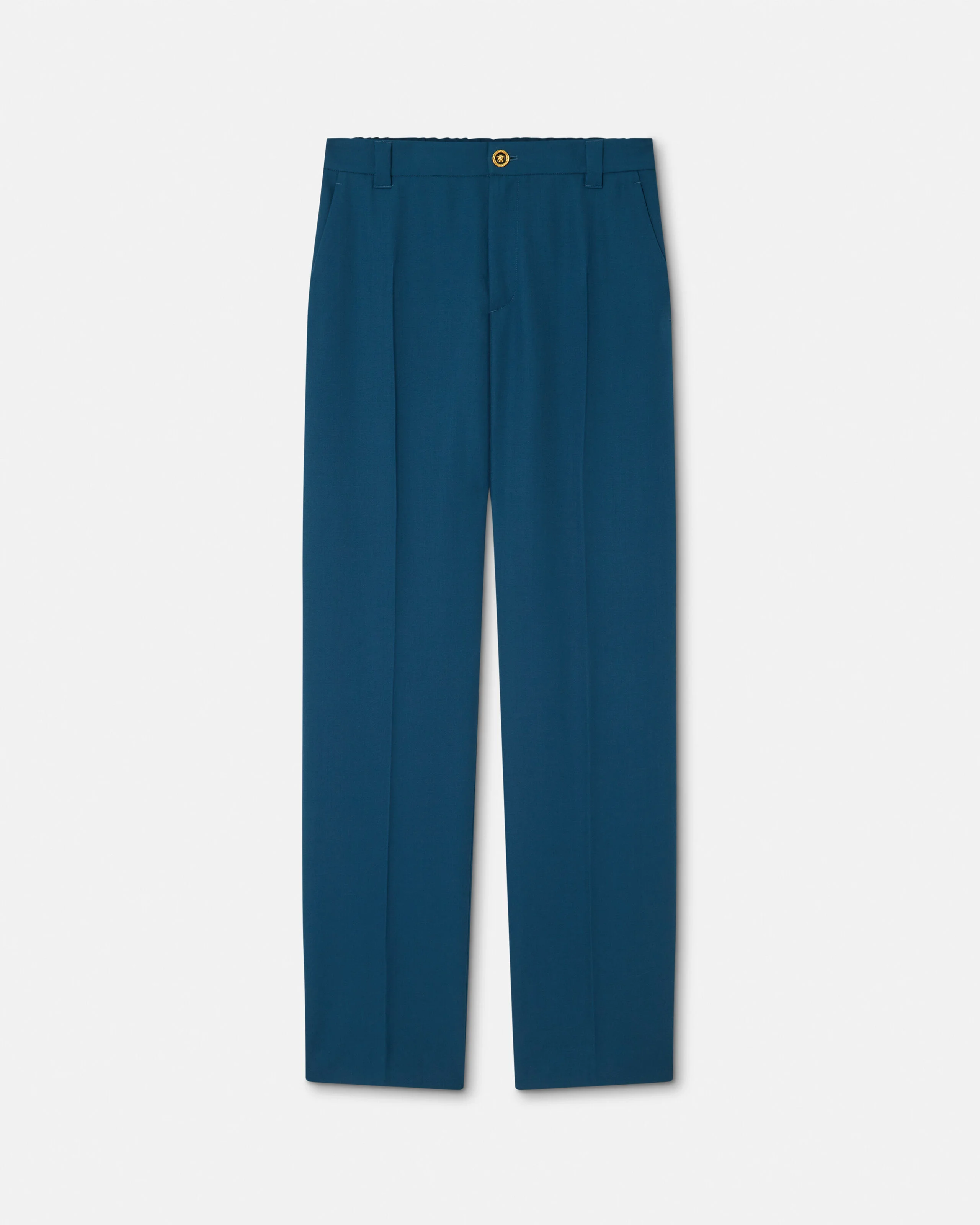 These straight-fit jogger pants are crafted from wool and feature an accent enamel Medusa button at the front closure and a jacquard Versace tailoring label at the back. - Medusa hardware - Versace tailoring label - Belt loops - Front button and zipper closure - Side pockets - Back welt pockets - Interior button closure - Elastic waistband - Outer composition: 100% Pure virgin wool - Lining: 100% Cotton Size & Fit - The model is 6'1" / 1.86 m tall and wears size 48 IT Item: 1018896-1A16732_1UO60