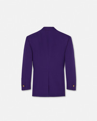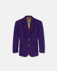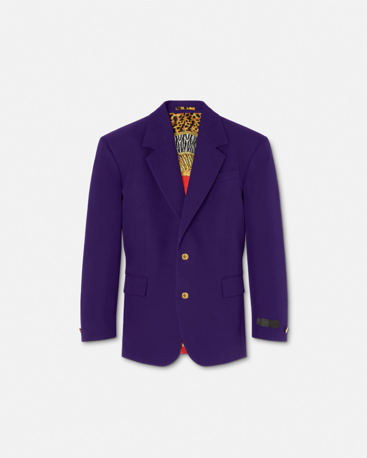 DETAILS This singlebreasted blazer in grain de poudre wool has a notched lapel with accent Medusa buttons and features a Wild Cats printed lining The sartorial style is detailed with a tonal jacquard Versace tailoring label on the sleeve - Medusa hardware - Versace tailoring label - Long sleeves - Notched lapels - Front button closure - Chest welt pocket - Front flap pockets - Interior welt pockets - Buttoned cuffs - Single back vent - Outer Composition: 100% Pure Virgin Wool - Lining 1: 100% Polyester - Lining 2: 100% Cupro - Lining 3: 100% Cotton Item: 1021527-1A09838_1LJ40 SIZE & FIT - The model is 6'2" / 1.87 m tall and wears size 48 IT