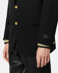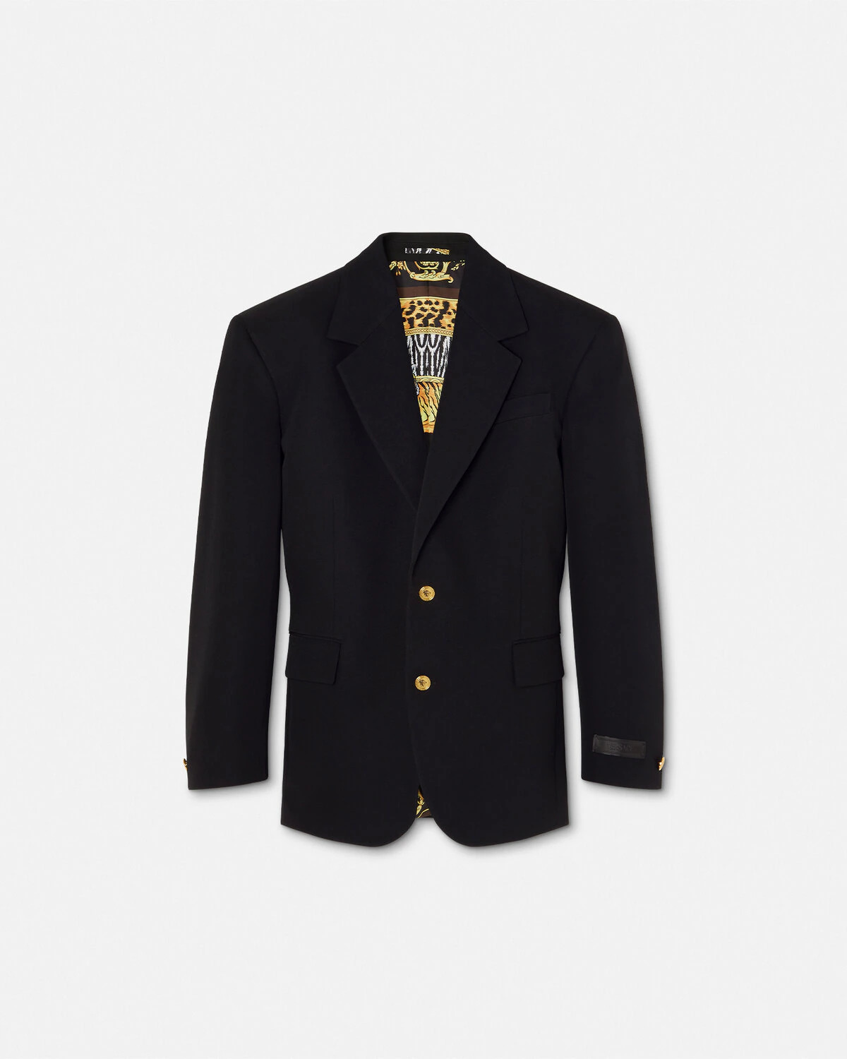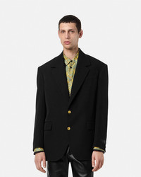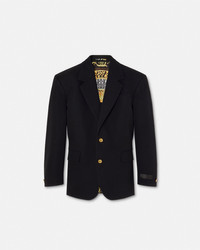 DETAILS This singlebreasted blazer in stretch grain de poudre wool has a notched lapel with accent Medusa buttons and features a Wild Cats printed lining The sartorial style is detailed with a tonal jacquard Versace tailoring label on the sleeve - Medusa hardware - Versace tailoring label - Long sleeves - Notched lapels - Front button closure - Chest welt pocket - Front flap pockets - Interior welt pockets - Buttoned cuffs - Single back vent - Outer Composition: 100% Pure Virgin Wool - Lining 1: 100% Polyester - Lining 2: 100% Cupro - Lining 3: 100% Cotton Item: 1021527-1A09838_1B000 SIZE & FIT - The model is 6'2" / 1.87 m tall and wears size 48 IT
