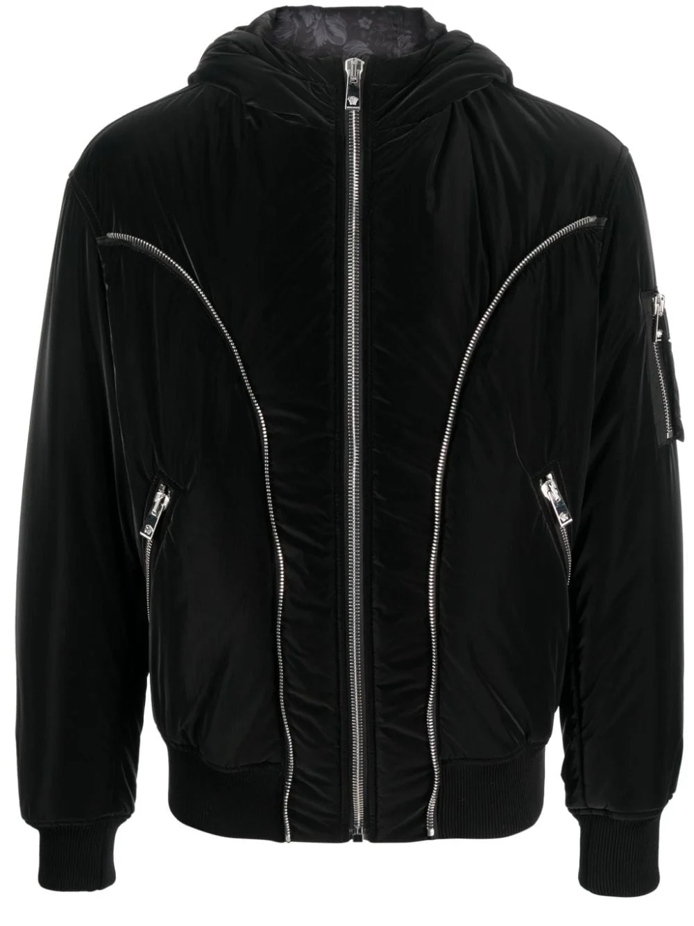 zip-detail puffer jacket Crafted from nylon with an opaque finish, this puffer jacket references Versace's signature Repeat bag through the curved zips that adorn the front and sleeves. A tonal Barocco Silhouette lining and zipped hood complete the all-black design. Highlights - Black - Padded design - Classic hood - Decorative zip detailing - Front zip fastening - Two diagonal pockets to the sides - Long sleeves - Contrast lining - Ribbed edge Made in Italy Composition Outer: Calf Leather 100%, Polyamide 100% Lining: Polyester 100%, Cotton 100% SIZE & FIT Model measurements Height 6 ft 2 in(1.87 m) Bust/Chest 38.18 in(97 cm) Hips 36.61 in(93 cm) Waist 29.13 in(74 cm) FittingInformation Designed for a relaxed fit, this piece allows for comfort and movement when worn The ribbed hem offers a close, comfortable fit Made from a padded non-stretch fabric, giving it no natural elasticity This piece fits true to size – take your usual size Washing instructions Machine Wash