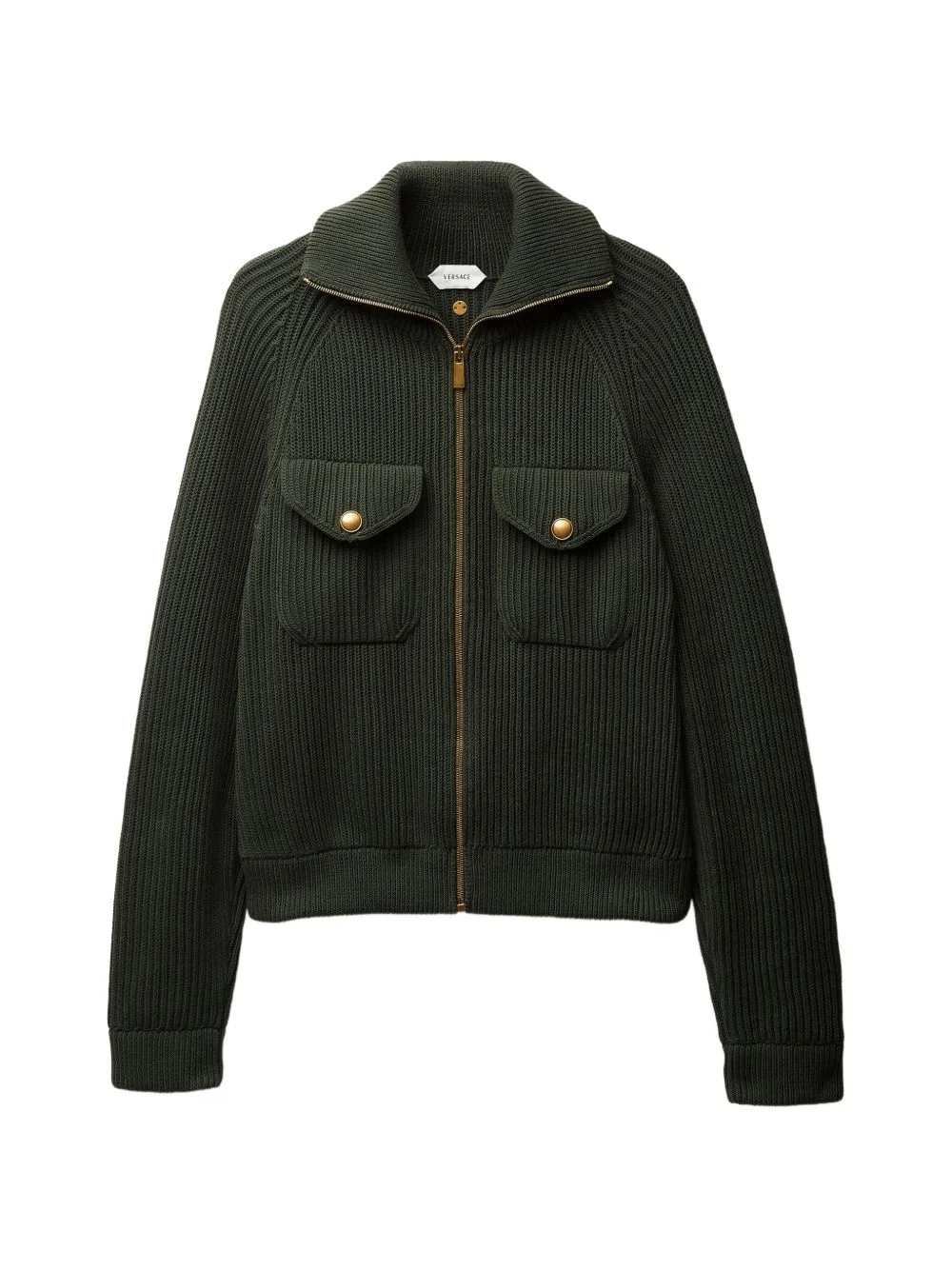 zip ribbed knit jacket Highlights - Dark green - Ribbed knit - Two front flap pockets - Gold-tone hardware - Zip fastening - High neck Imported Composition Fabric 100% Washing instructions Read Manufacturer Guidelines