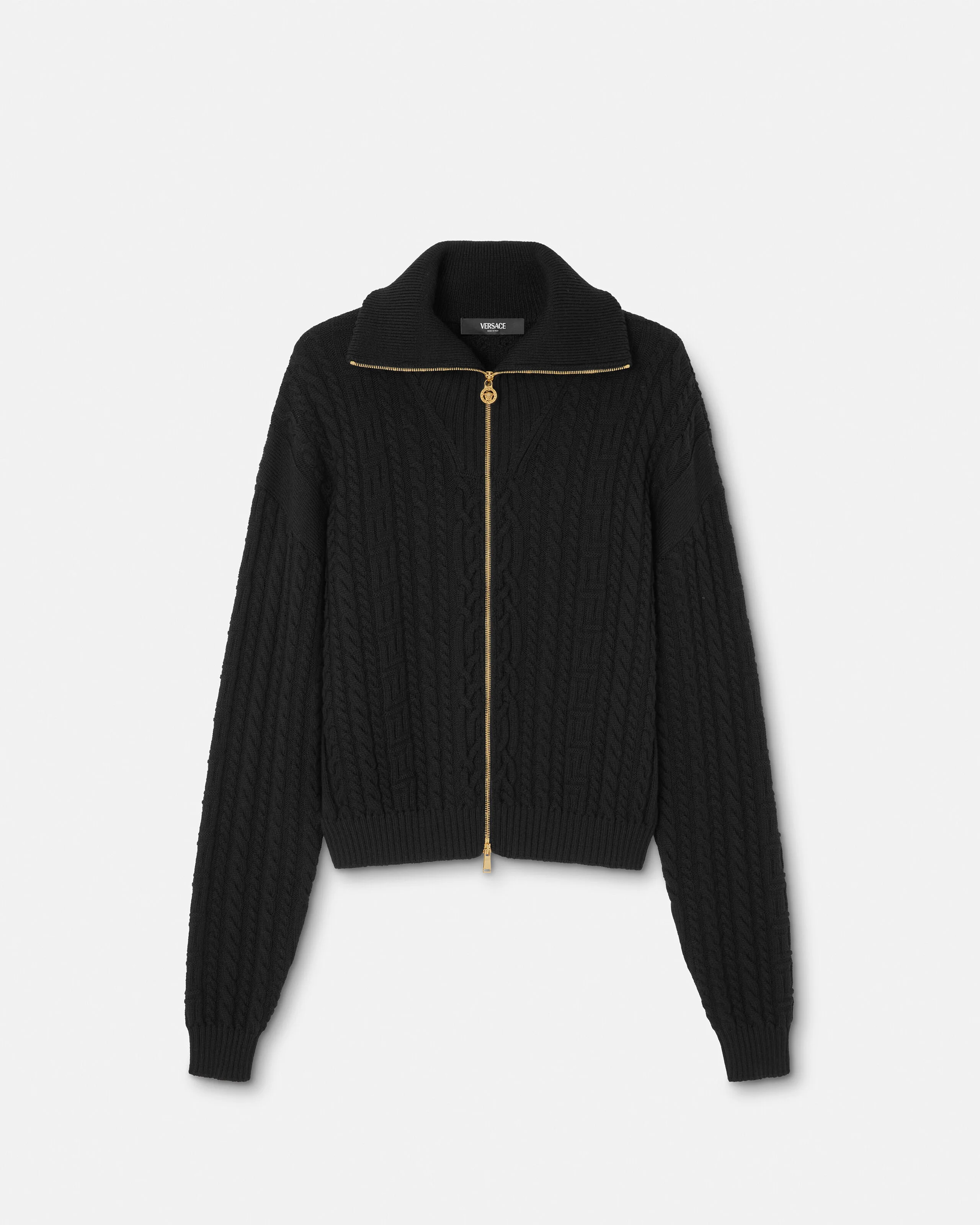 This ribbed and cable-stitched wool-knit sweater features a Medusa Biggie zip puller and a tonal Medusa thread-embroidery at the back. - Medusa embroidery - Medusa Biggie hardware - Long sleeves - High neck - Front zip closure - Outer composition: 100% Pure virgin wool - NATIVA™ regeneratively sourced wool - Embroidery: 100% Viscose - Trim: 100% Polyester Size & Fit - The model is 6'1" / 1.86 m tall and wears size 48 IT Item: 1021793-1A16356_1B000