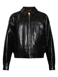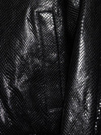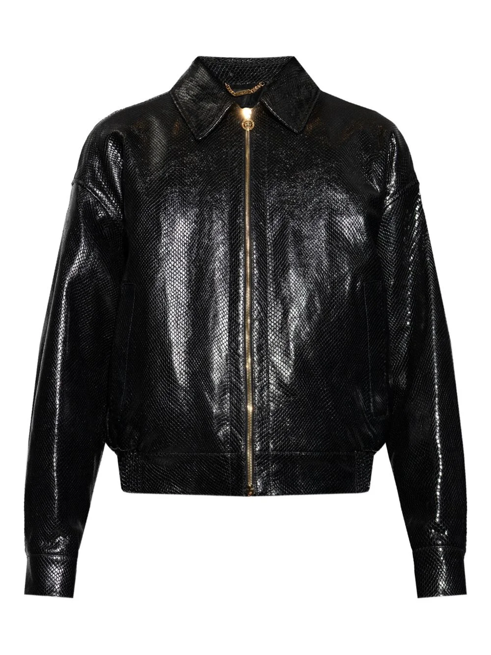 zip-up leather jacket Highlights - Black - Zip fastening - Pointed collar - Long sleeves - Python effect - Elastic waistband Made in Italy Composition Outer: Goat Skin 100% Lining: Cupro 100%, Cotton 100% Washing instructions Read Manufacturer Guidelines