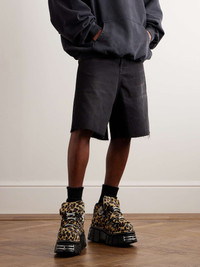 Vetements' platform sneakers are part of the brand's collaboration with New Rock. Made in Spain from leopard-print pony-hair, they fasten with branded laces anchored by burnished silver-tone hooks that match the embossed hardware at the front. The exaggerated soles are thickly treaded and finished with both brands' emblems. Size & Fit - Fits true to size. Take your normal size - Only available in full sizes, go up to the nearest whole size if you take a half size - European sizing Details & Care - Leopard-print pony hair (Cow) - Lace-up - Come in a presentation box - Style number: UE54SN100L