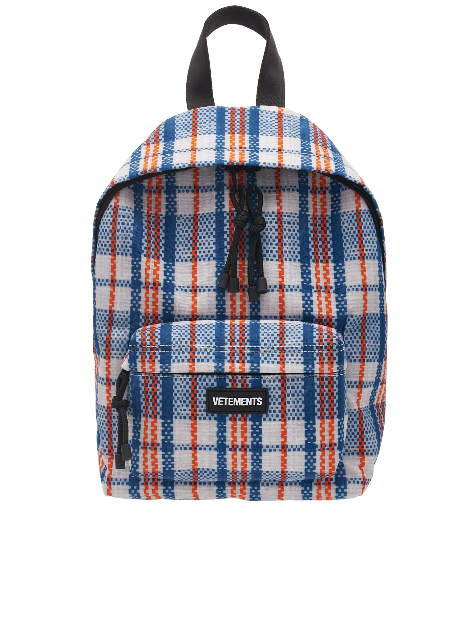 VETEMENTS bag in blue, nylon construction, plaid pattern, top-handle loop, adjustable shoulder straps, main two-way zip pocket, front zip pocket, rubber logo, twill lining. Made in Italy 100% Nylon 11.5" Height, 12" Width, 4" Depth
