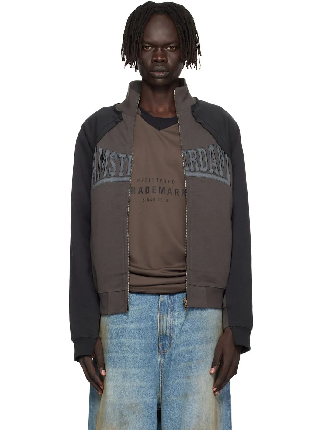 French terry sweatshirt. · Raw edges throughout · Paneled construction · Stand collar · Two-way zip closure · Embroidered text and welt pockets at front · Rib-knit hem and cuffs · Raglan sleeves · Logo embroidered at back collar Supplier color: Chocolate brown Body: 80% cotton, 20% polyester. Trim: 74% cotton, 24% polyester, 2% elastane. Made in Portugal 252669M202014