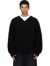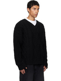 Cable-knit wool sweater. · Rib-knit V-neck, hem, and cuffs · Dropped shoulders · Rubberized logo patch at back collar Supplier color: Black 100% wool. Made in Italy 252669M201001