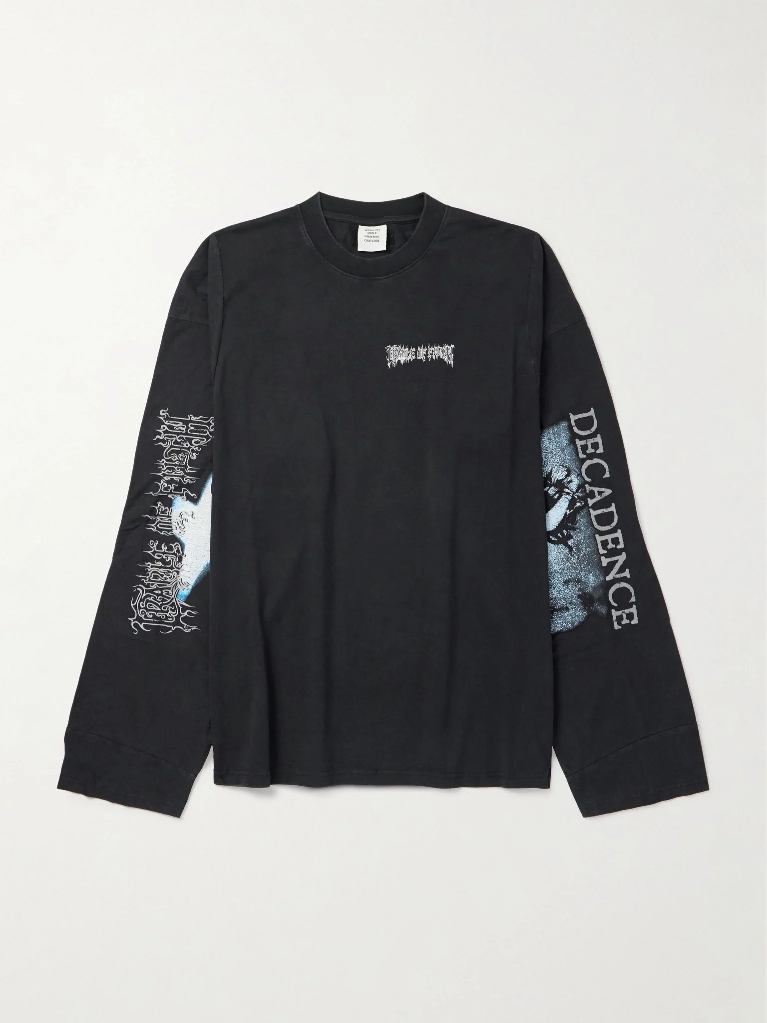 Vetements' T-shirt is printed with the logos of heavy metal bands Decadence and Cradle of Filth along the sleeves. It’s cut for an oversized fit from cotton-jersey and washed for a lived-in look and feel. Size & Fit - Intended to be oversized; we recommend sizing down if you prefer a closer fit - Mid-weight, slightly stretchy fabric - Model is shown wearing a M - Model measures: chest 38"/ 96cm, height 6'0"/ 183cm Details & Care - Multicoloured cotton-jersey - 100% cotton - Machine wash