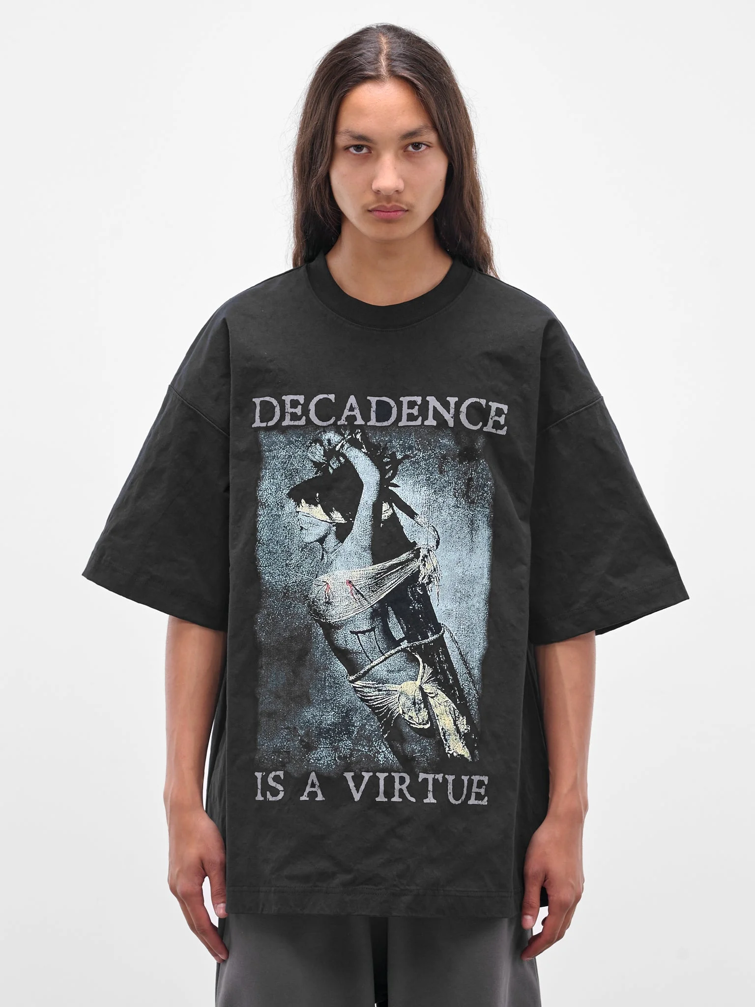 This black t-shirt channels a collaborative edge with Cradle of Filth, showcasing a 'Decadence is a Virtue' graphic faded and cracked for a worn effect. Finished with short sleeves, dropped shoulders, and back logo embroidery. Featuring: • Oversized fit • Faded and cracked front graphic print • Crewneck • Back logo embroidery • Dropped shoulders and dropped shoulders • Made in Portugal • 100% Cotton • Standard sizing Model is 5'11.5" wearing size M. Shoulders: 18" Chest: 36" Waist: 30"
