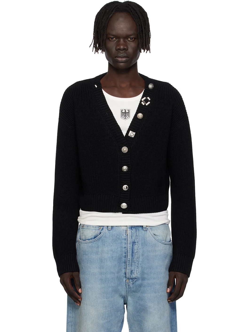Rib-knit merino wool cardigan. · V-neck · Button closure extends to neck · Cropped hem · Dropped shoulders · Engraved and crystal-cut hardware Supplier color: Black 100% merino wool. Made in Italy 252669M200000