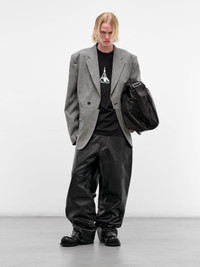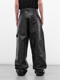 Black calfskin leather trousers with five-pocket styling and carpenter's loop detail. Featuring: • Baggy fit • Wide leg • Belt loops and front button and zip fly closure • Five-pocket styling • Side carpenter's loop and tool pockets • Made in Italy • 100% Calfskin Leather • Standard sizing Model is 6'0" wearing size M. Shoulders: 19" Chest: 35" Waist: 28"